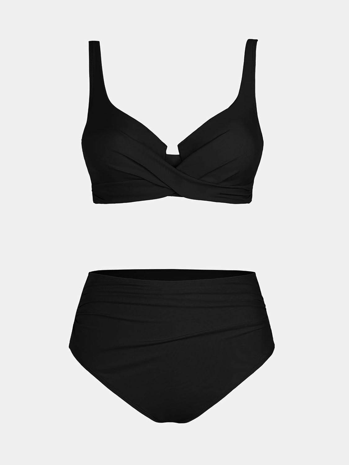 CUPSHE Women’s Bikini Sets High Waisted Swimsuit Underwire Adjustable Straps Twisted Hook Full Coverage Bottom(Black)