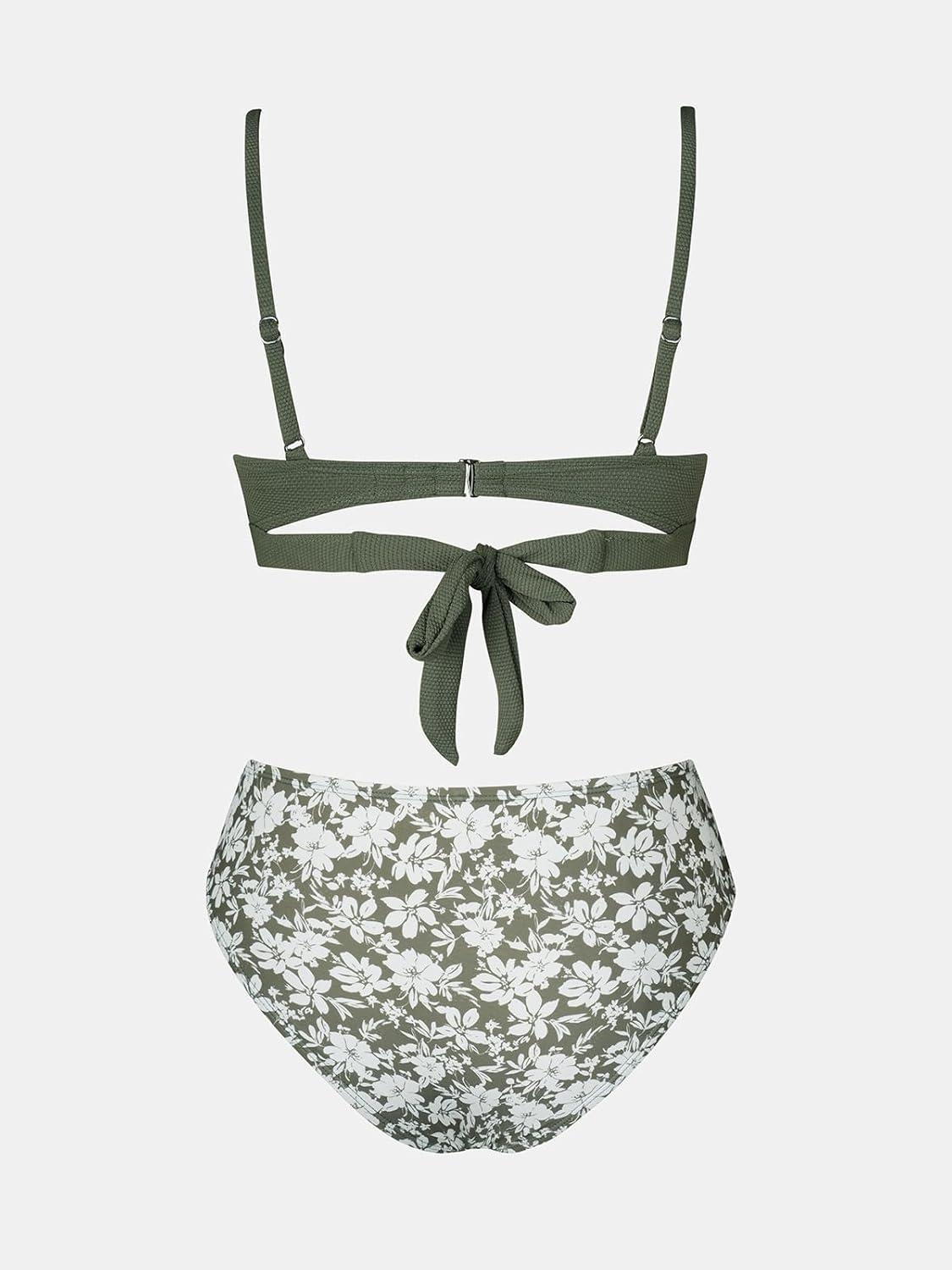 CUPSHE Women’s Bikini Sets Sweetheart Neck Two Piece Bathing Suit Cutout Textured Adjustable Straps Mid Rise Bottom(Sage Green/Floral)