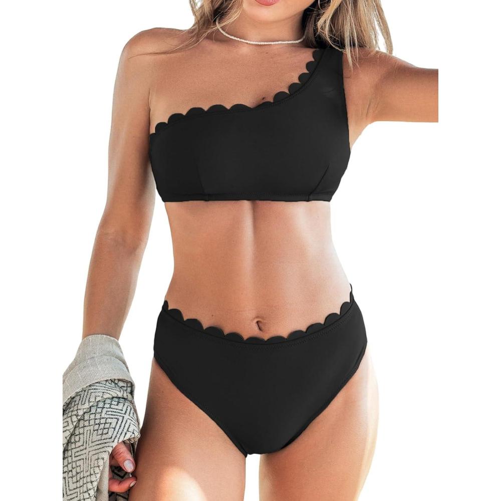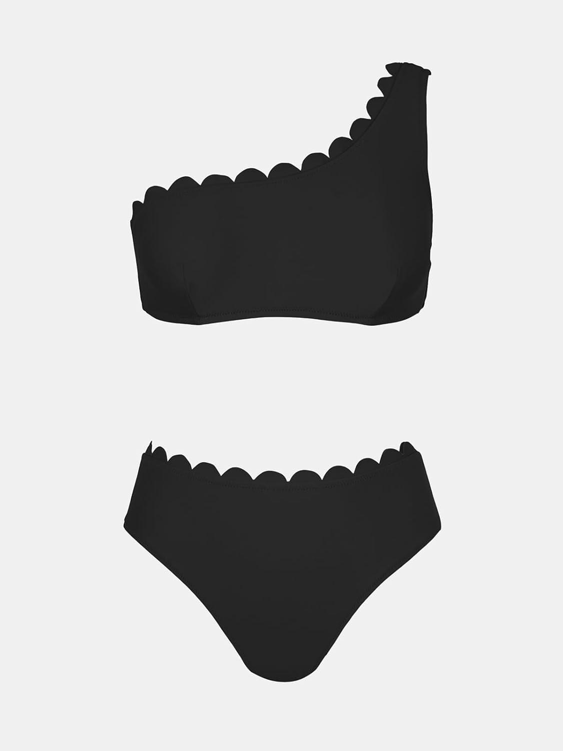 CUPSHE Women’s Bikini Sets Two Piece Bathing Suit One Shoulder Scalloped Wide Strap Back Hook(Black)