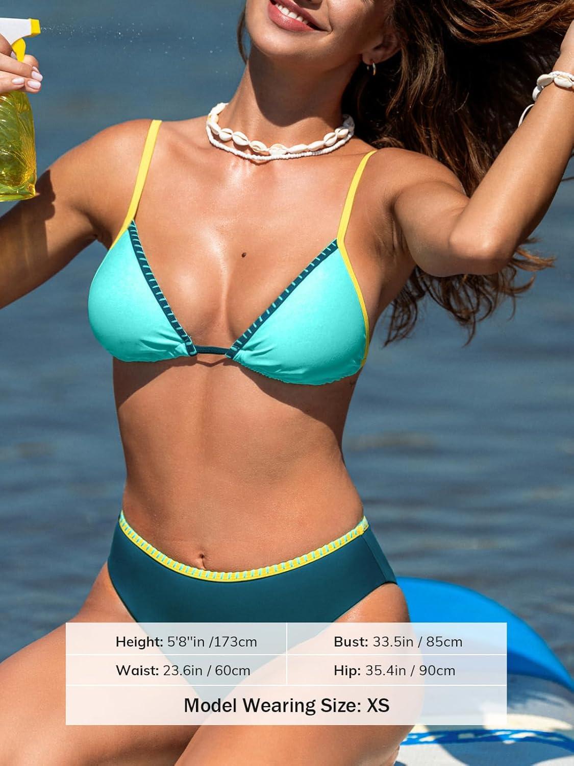 CUPSHE Women’s Bikini Sets Two Piece Swimsuit Bathing Suits V Neck Colorblock Back Tie Adjustable Straps Stitching(Aqua/Teal/Yellow)