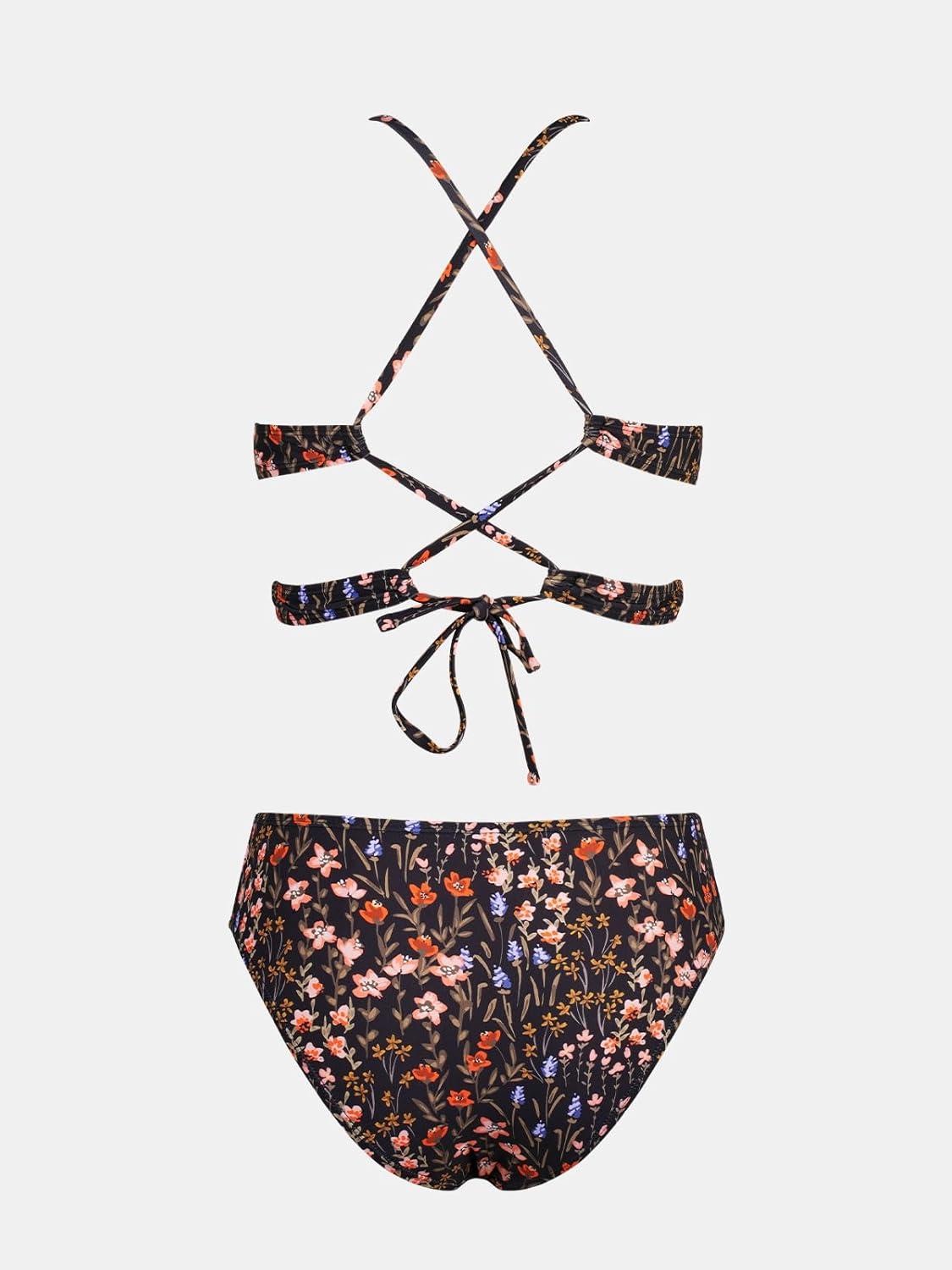 CUPSHE Women’s Bikini Sets Two Piece Swimsuit Mid Rise Bathing Suits V Neck Crisscross Back Tie Textured(Black Floral)