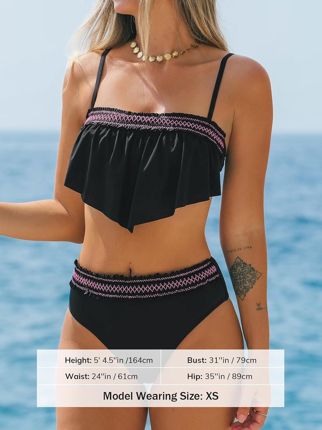 CUPSHE Women’s Bikini Sets Two Piece Swimsuit Ruffled Square Neck Adjustable Straps Bathing Suits Back Hook Stitching(Black/Pink)
