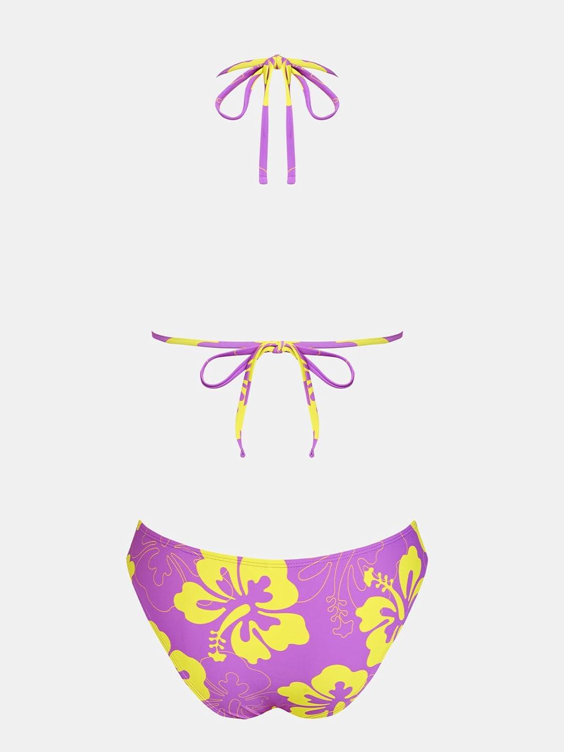 CUPSHE Women’s Bikini Sets Two Piece Swimsuit V Neck Halter Back Self Tie Low Rise Bottom(Purple/Yellow Floral)