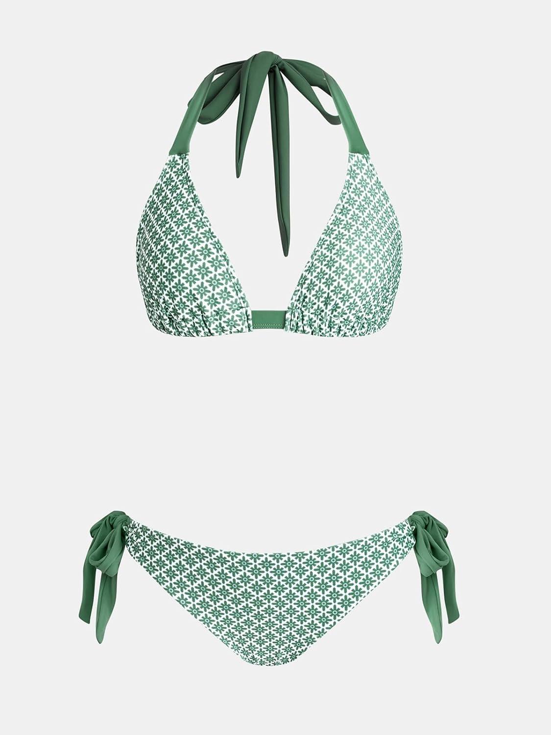 CUPSHE Women’s Bikini Sets Two Piece Swimsuit V Neck Reversible Bottom Halter Self Tie Back Hook(White/Green/Floral)
