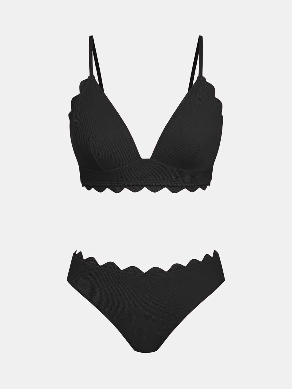 CUPSHE Women’s Bikini Swimsuit Scalloped V Neck Lace Up Low Waisted Bathing Suit(Star Black)