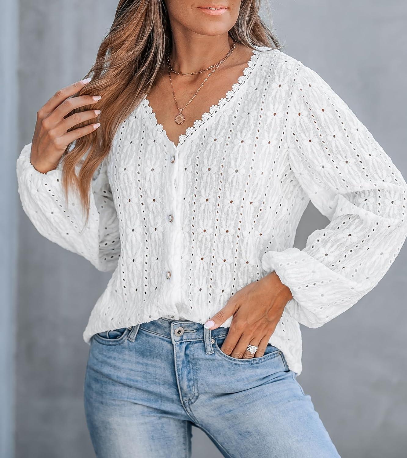 CUPSHE Women’s Blouses Eyelet Tops Long Sleeve V Neck Puff Sleeve Shirts Dressy Casual(White)