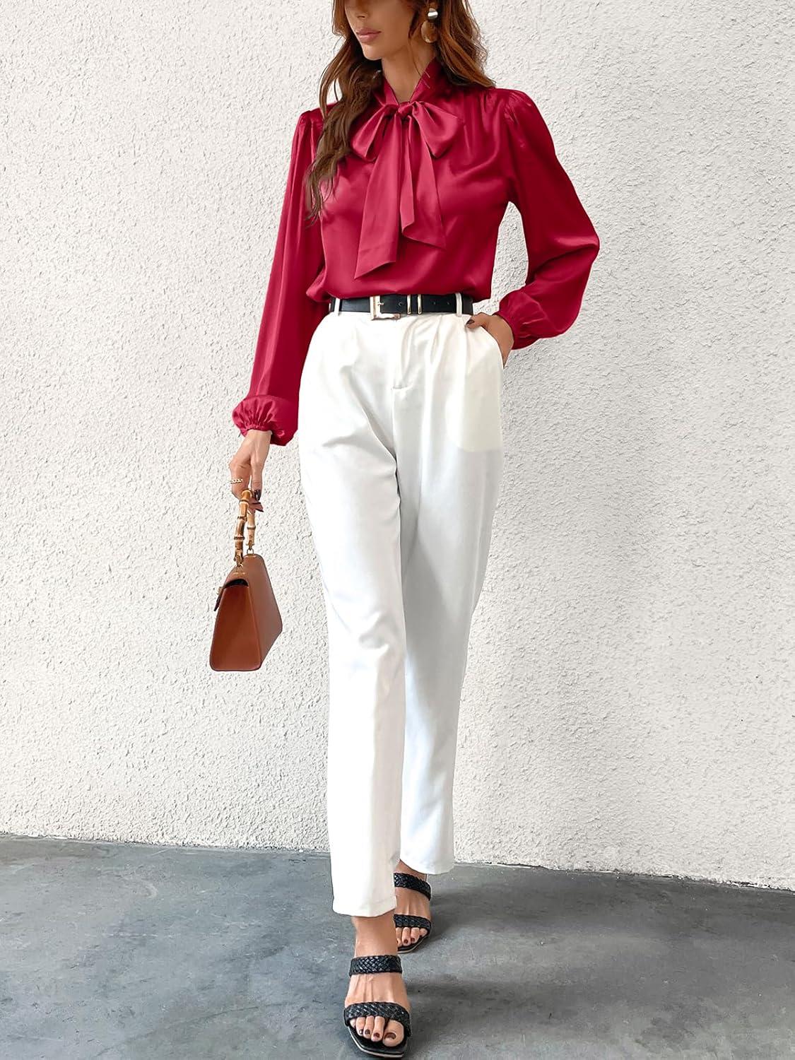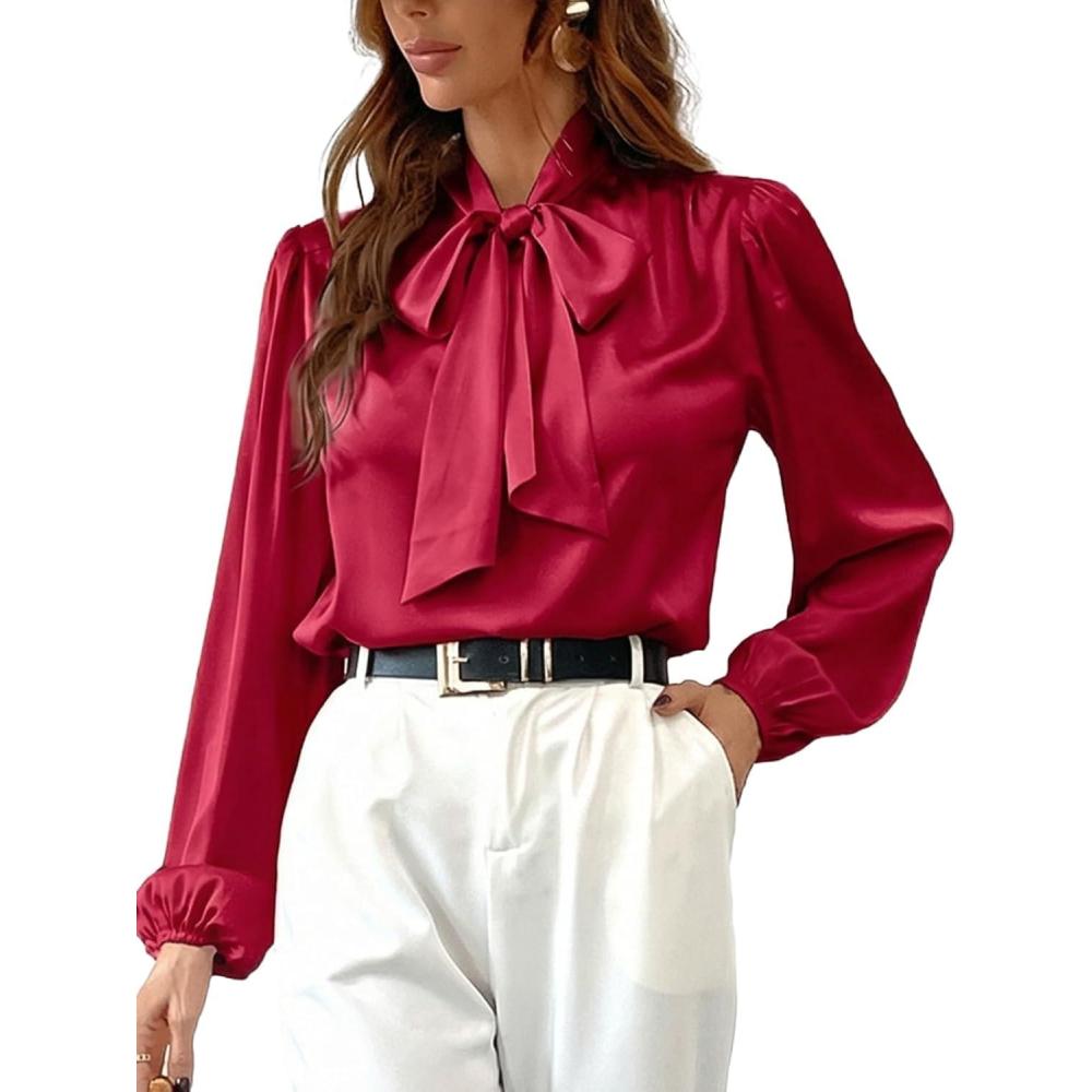 CUPSHE Women’s Blouses Long Sleeve Satin Shirts Bow Tie High Neck Tops Dressy Casual(Red)
