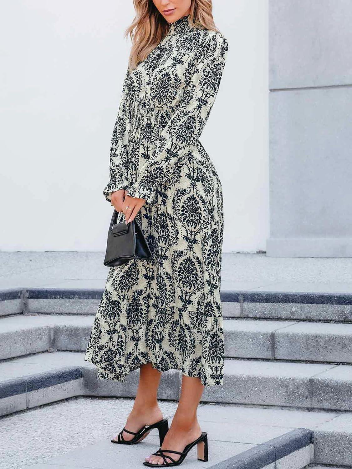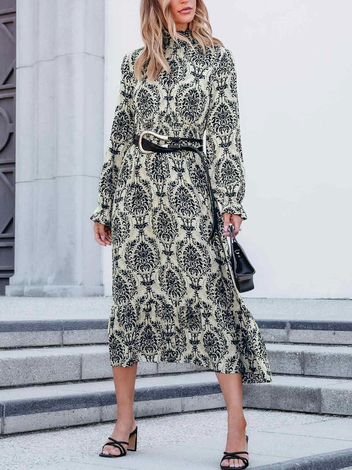 CUPSHE Women’s Boho Ruffle Maxi Fall Dress Mock Neck Long Lantern Sleeve Elastic Waist Paisley Casual Autumn Dresses(Paisley)