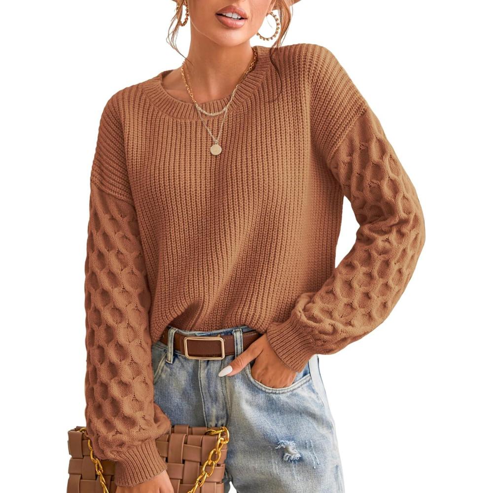 CUPSHE Women’s Cable Knit Sweater Long Sleeve Crew Neck Sweaters Fall Pullover Sweater Tops(Brown)