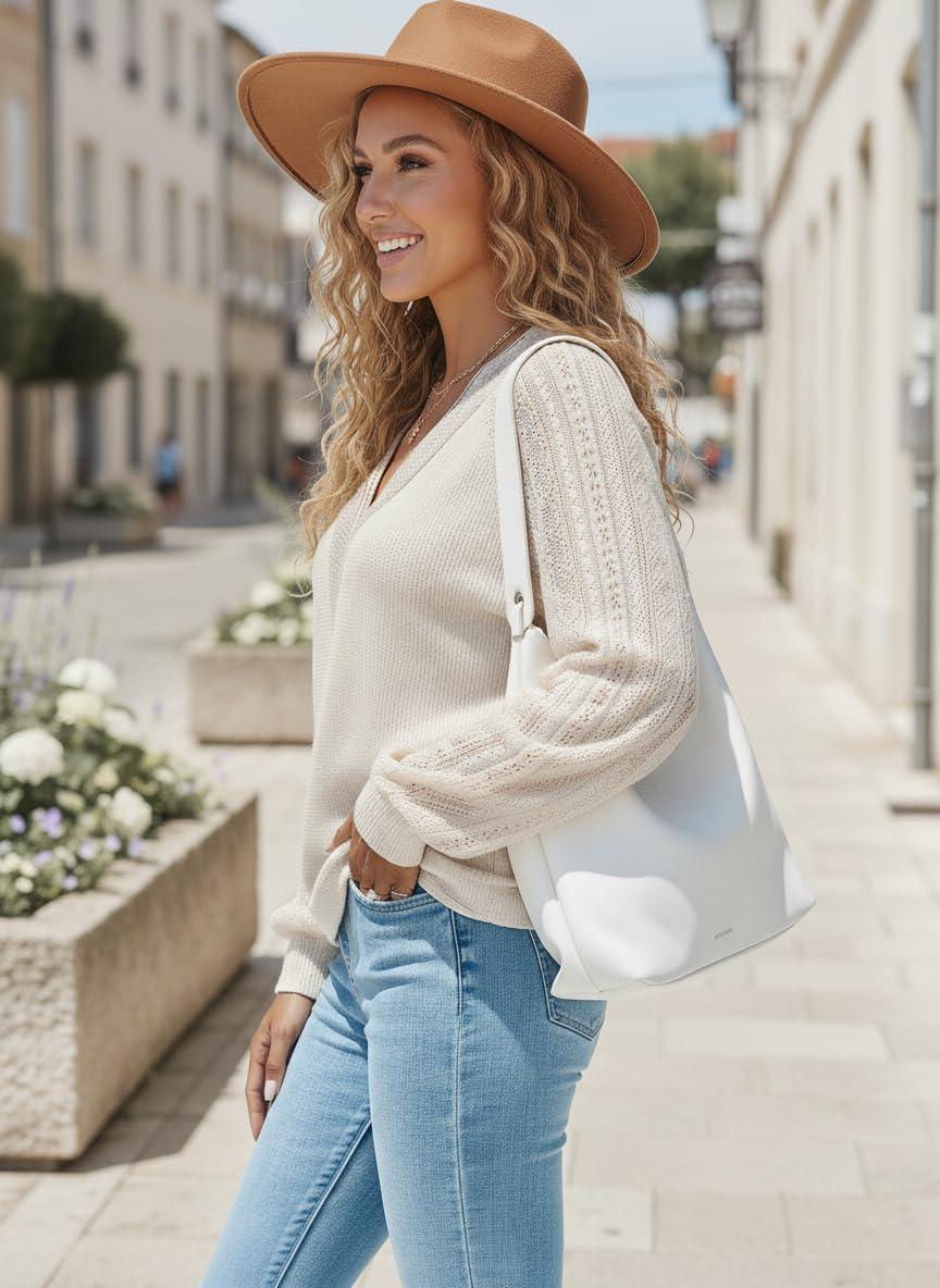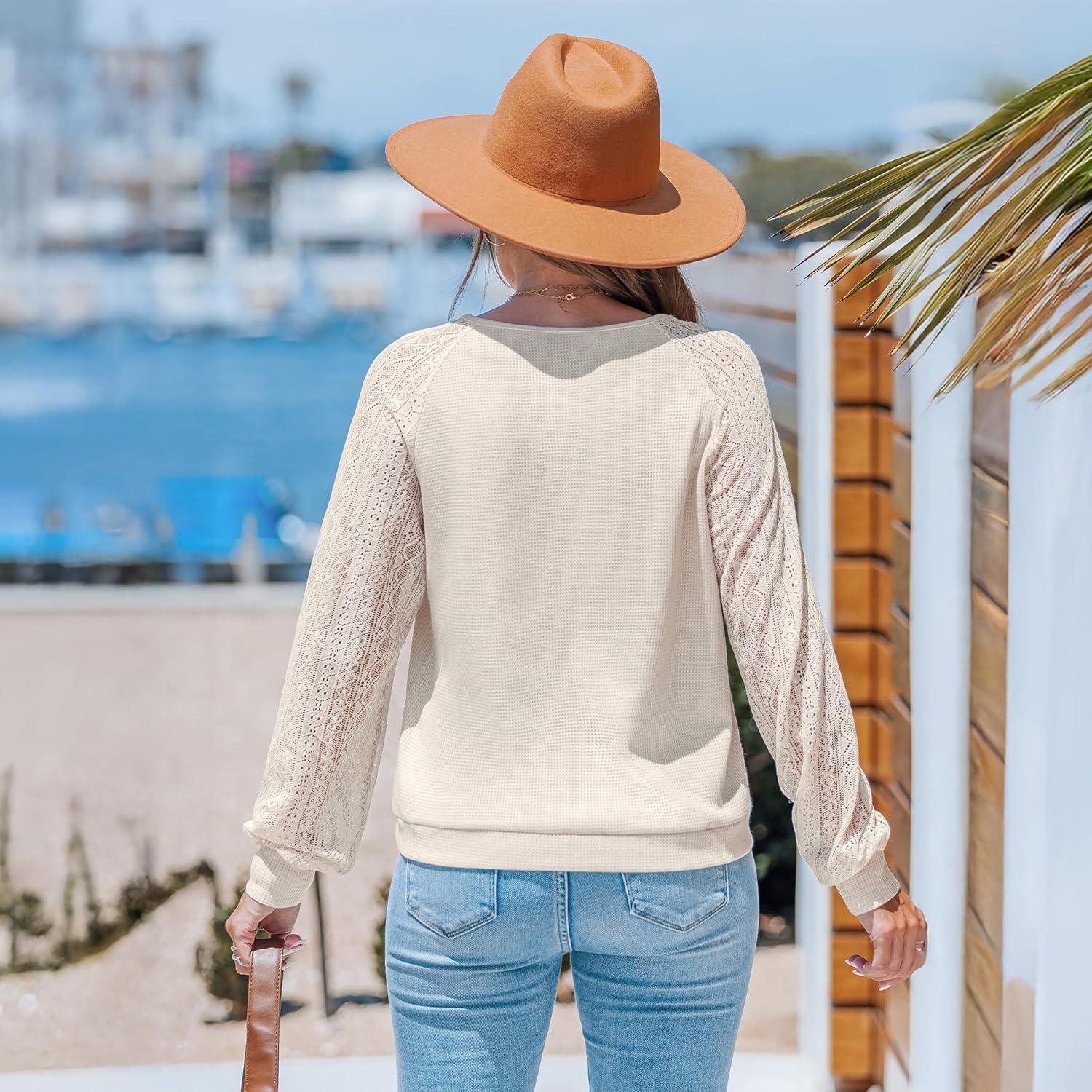 CUPSHE Women’s Casual Long Lace Sleeve V Neck Tops 2025 Fall Loose Shirts Blouse(Beige)