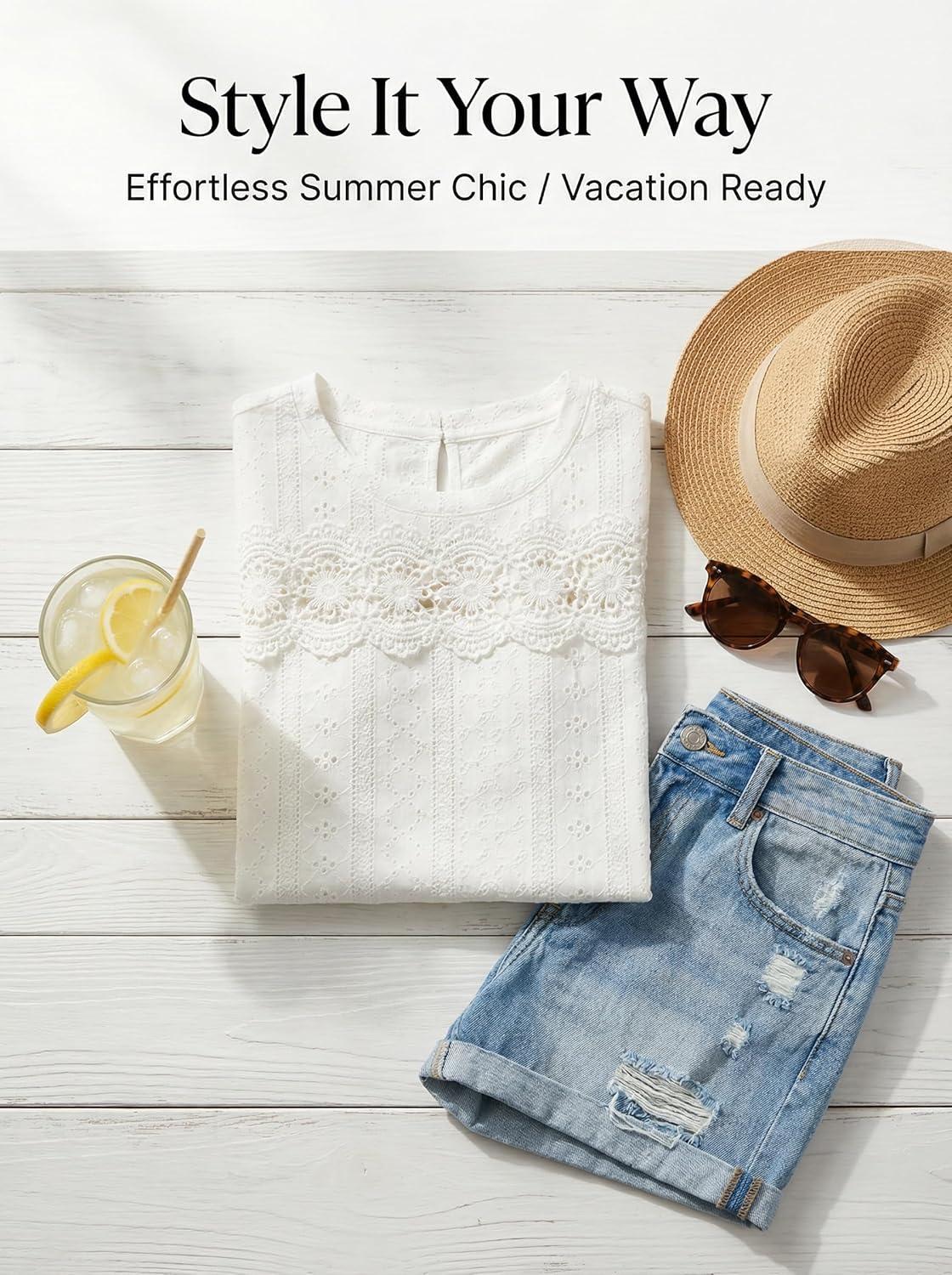 CUPSHE Women’s Casual Short Sleeve Crew Neck Hollow Out Beach Blouse Summer Top 2026(White)