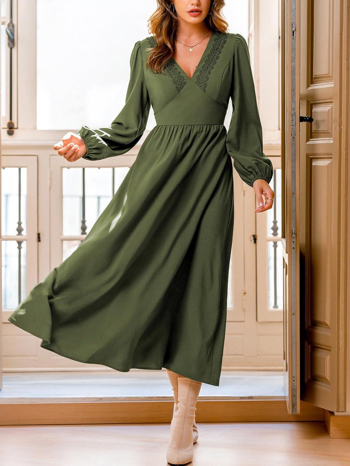 CUPSHE Womens Fall Wedding Guest Dress Long Sleeve V Neck Maxi Dress Smocked Waist Long Flowy Midi Dresses(Green)