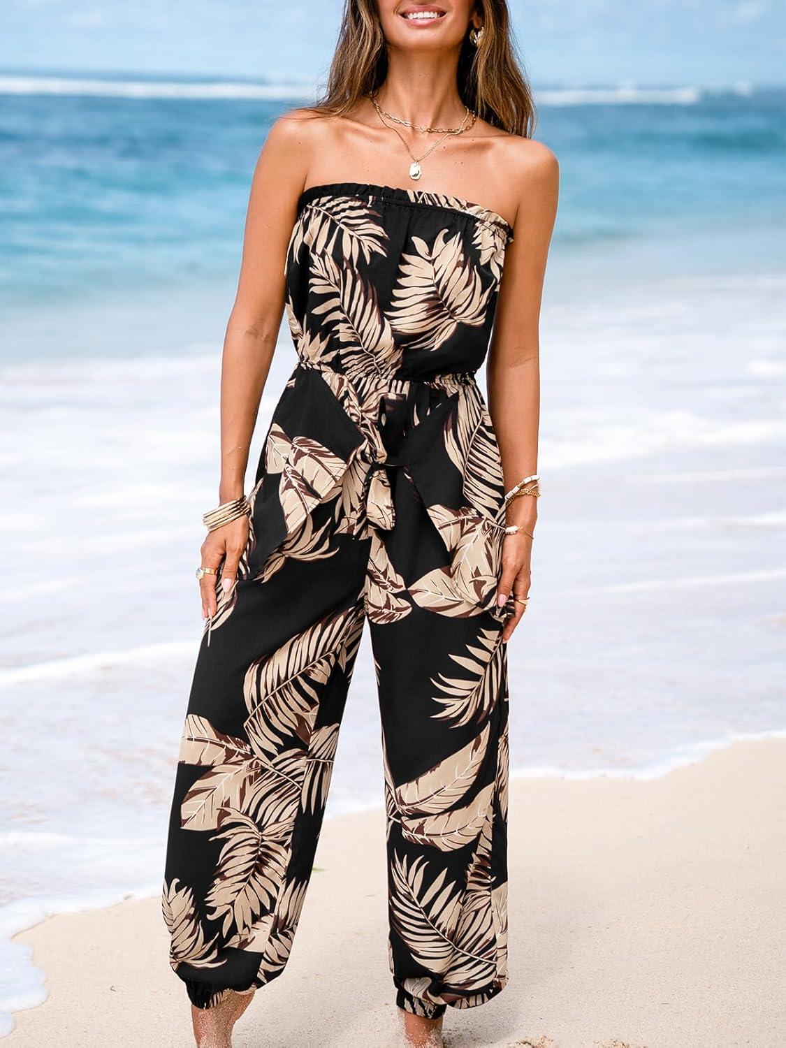 CUPSHE Women’s Jumpsuit Tropical Off-Shoulder Sleeveless One Piece Casual Summer Outfits Romper(Black Beige Palm)