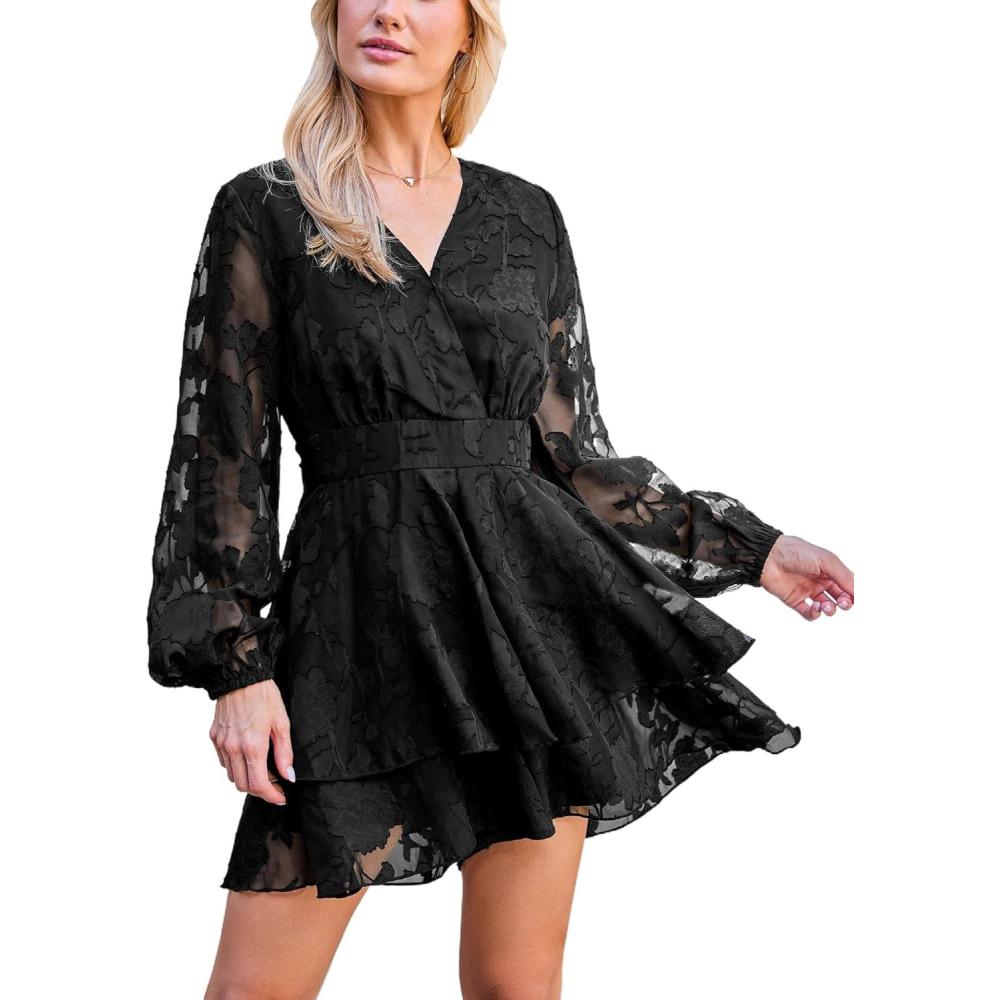 CUPSHE Womens Lace Romper Dressy V Neck Long Sleeve One Piece Overall Tunic Waist Casual Flowy Fall Formal Mini Jumpsuit(Black)