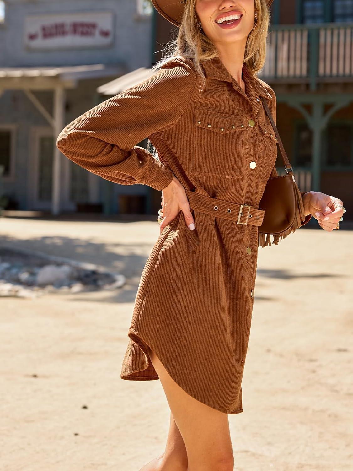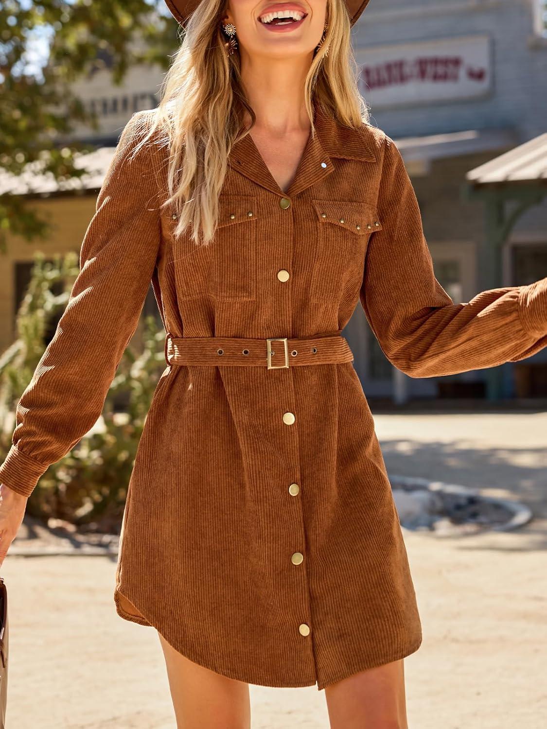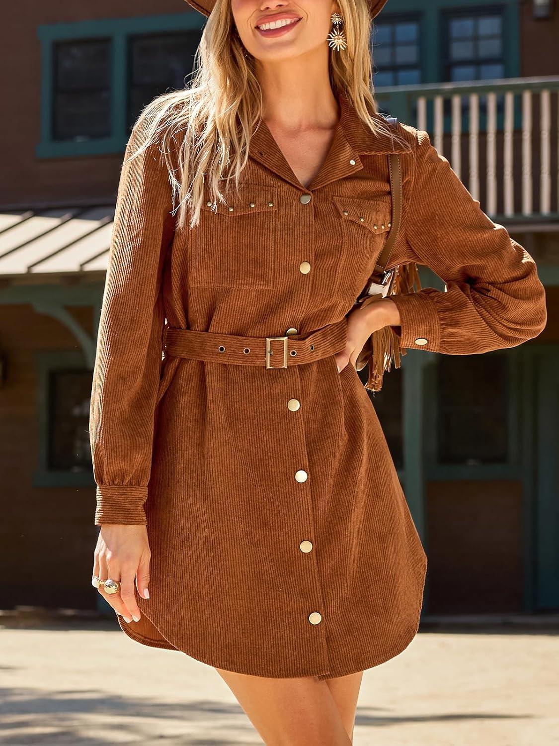 CUPSHE Womens Long Sleeve Fall Dresses Button Casual Belted Corduroy Pockets Fitted Work Mini Shirt Dress(Brown)