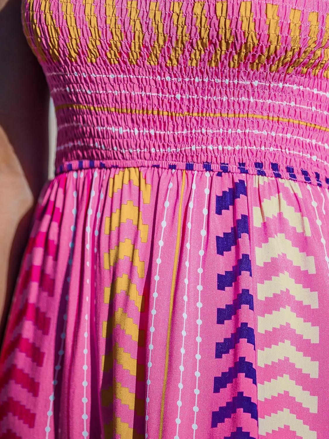 CUPSHE Women’s Maxi Dress Casual Smocked Straps Paisley Ruffled Slit A Line Long Beach Summer Dress(Pink Paisley)