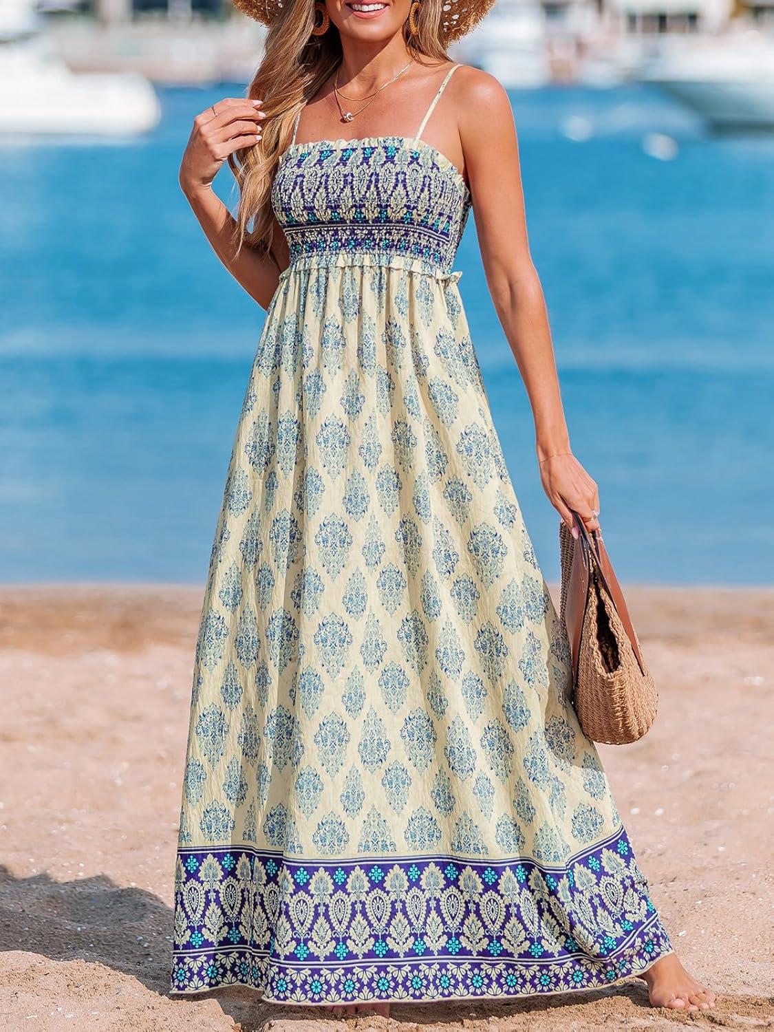 CUPSHE Women’s Maxi Dress Ditsy Floral Smocked Summer Sundress Sleeveless Ruffled Spaghetti Straps Long Beach Formal Dress(Blue Printed)