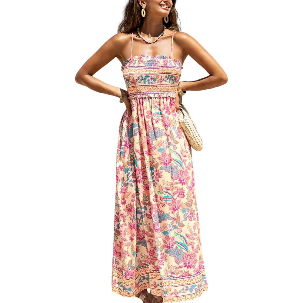 CUPSHE Women’s Maxi Dress Ditsy Floral Smocked Summer Sundress Sleeveless Ruffled Spaghetti Straps Long Beach Formal Dress(Pink Printed)