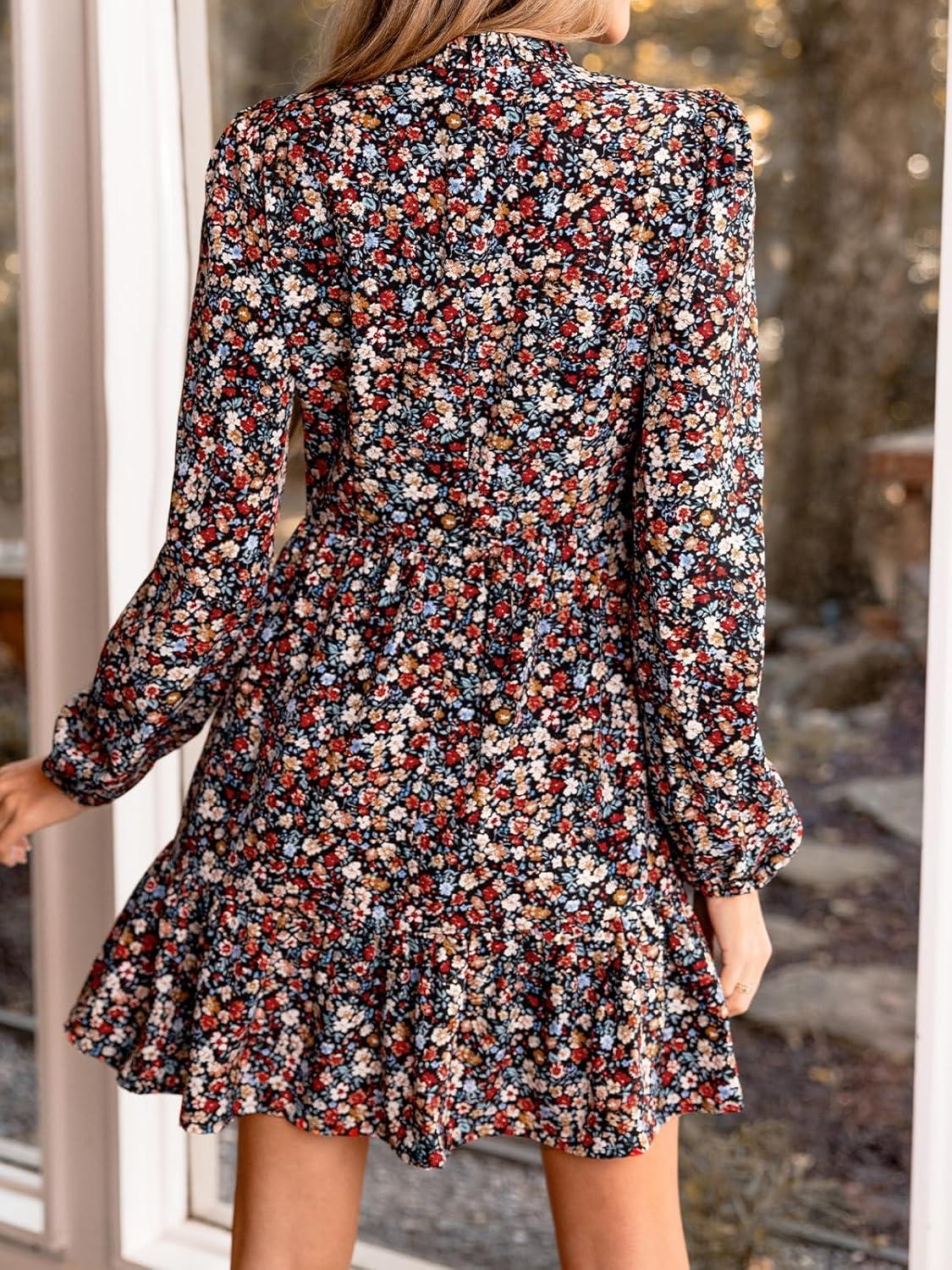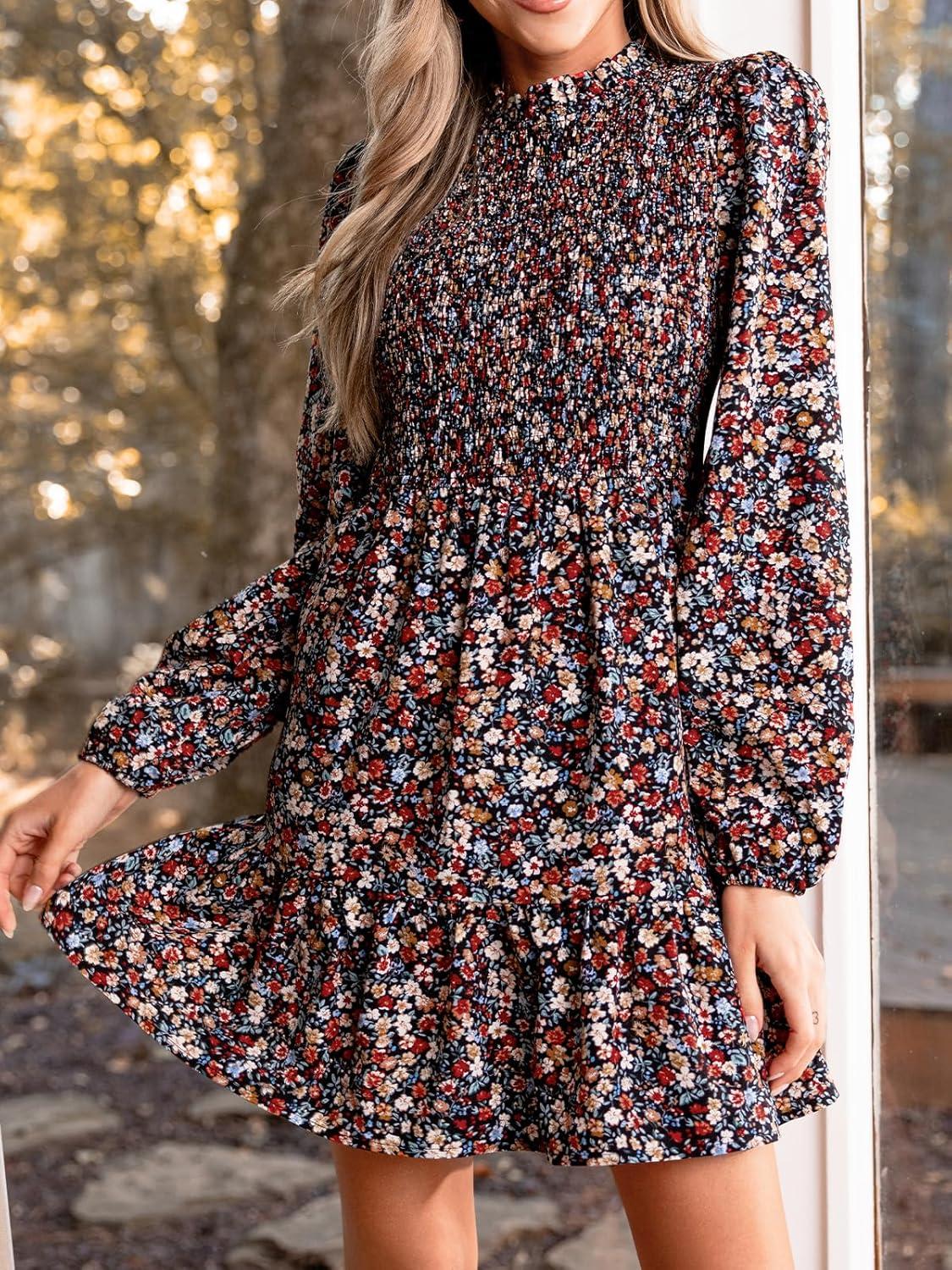 CUPSHE Women’s Mini Dress Mock Neck Smocked Long Bishop Sleeves Tiered Ruffled Hem Woven A Line Short Cocktail Dresses(Black Floral)