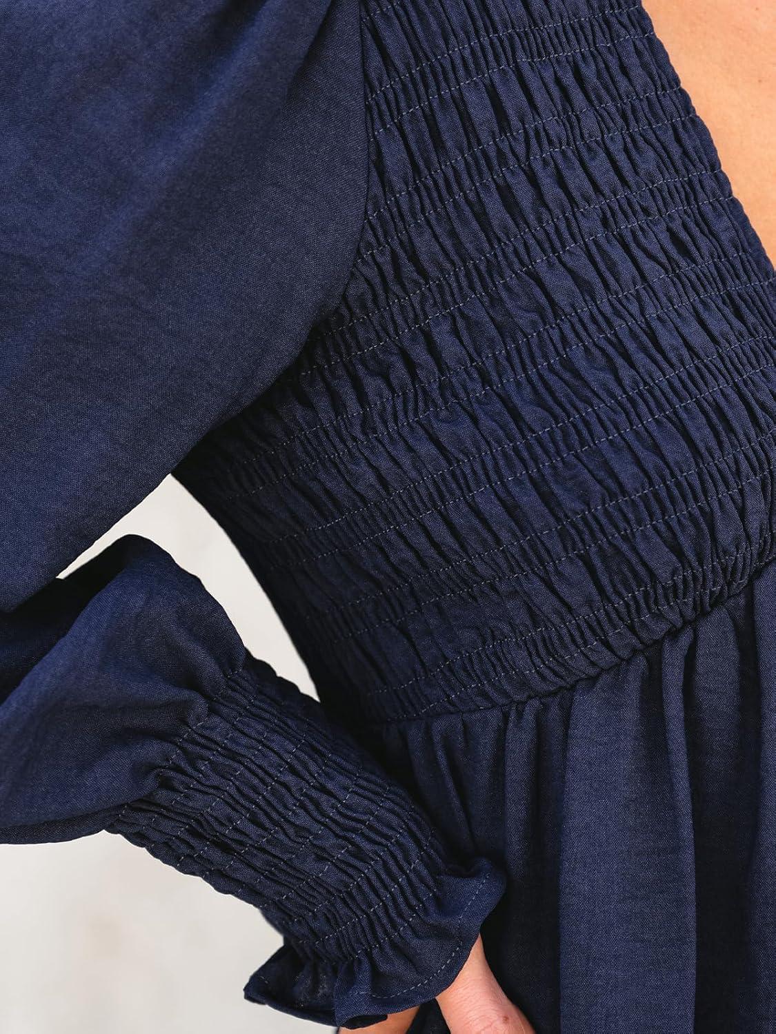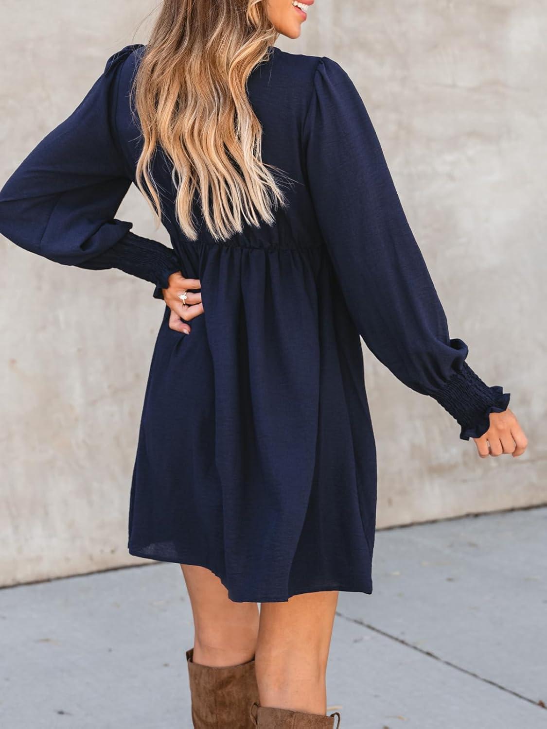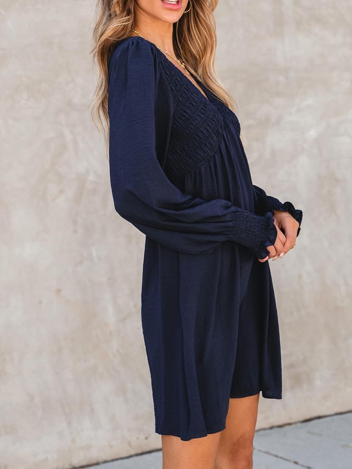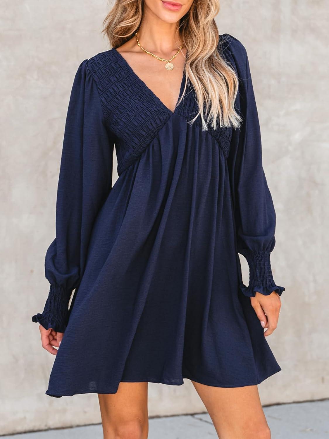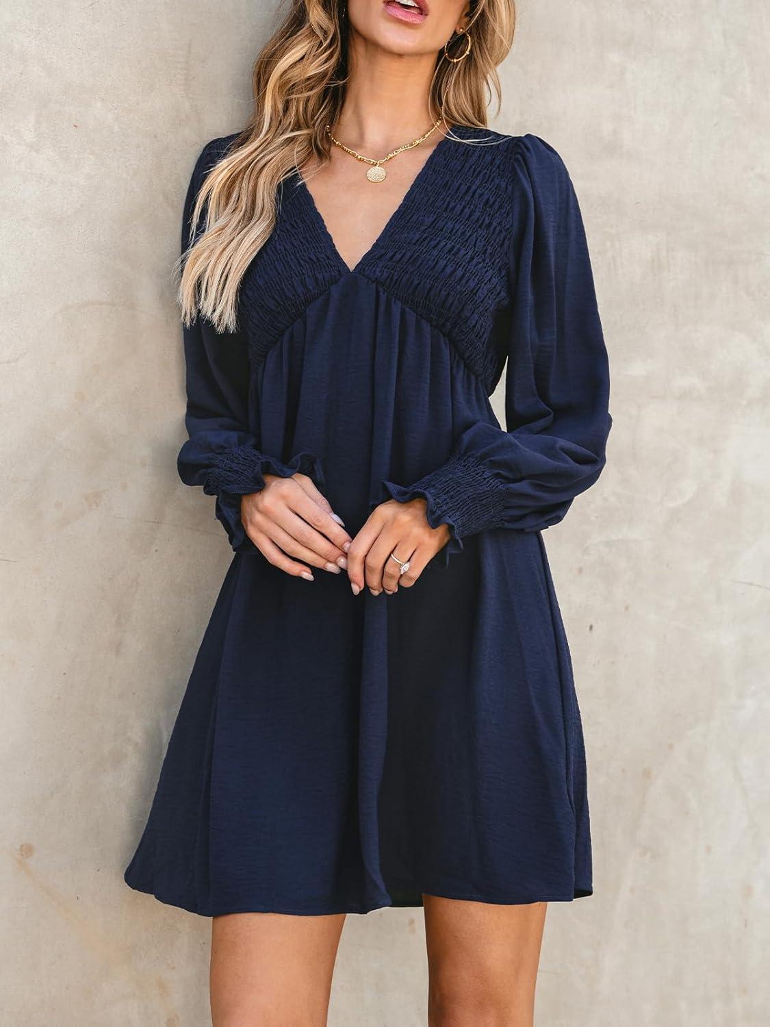 CUPSHE Women’s Mini Dress Smocked V Neck Long Sleeve Empire Waist Casual A Line Dress(Navy Blue)