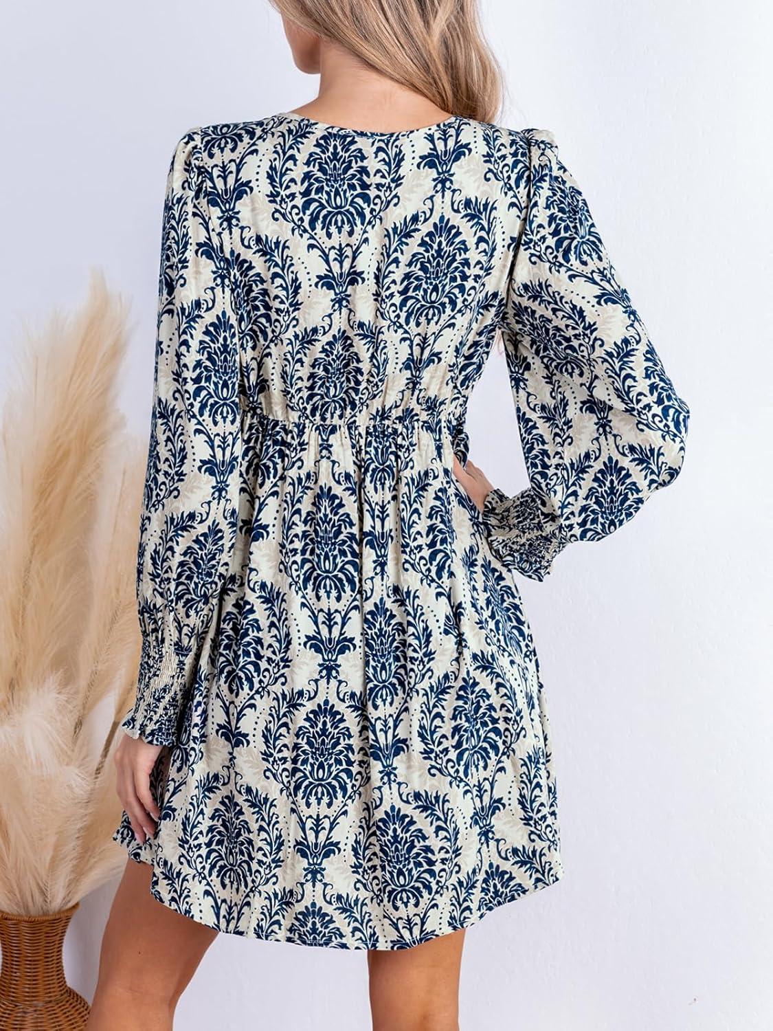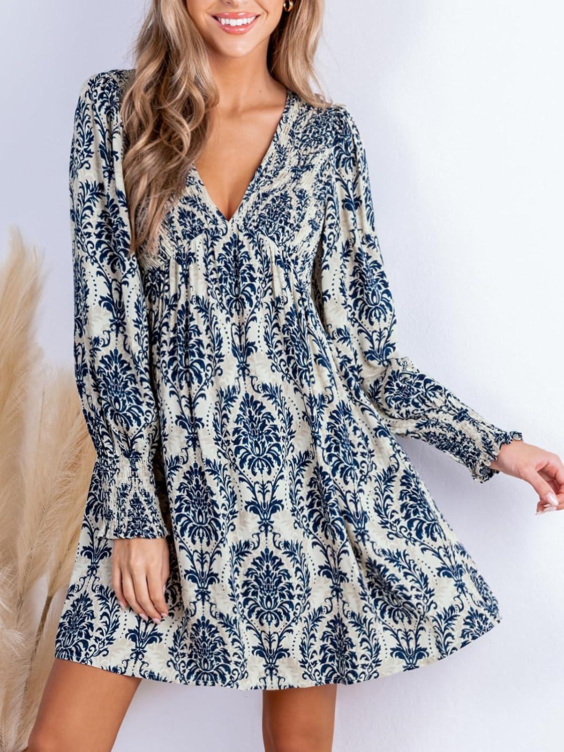 CUPSHE Women’s Mini Dress Smocked V Neck Long Sleeve Empire Waist Casual A Line Dress(Navy Paisley)