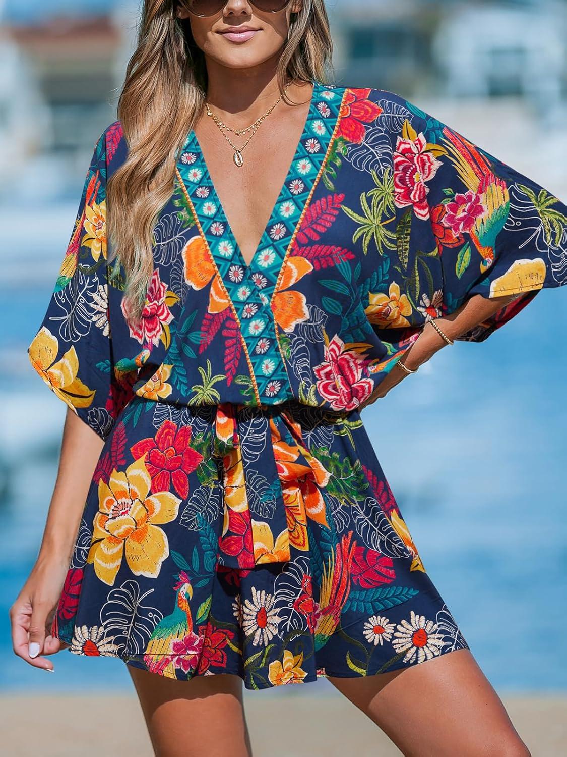 CUPSHE Women’s Mini Dress V Neck Floral Half Dolman Sleeve Belted Loose Fit Short Summer Beach Dress(Black Floral)