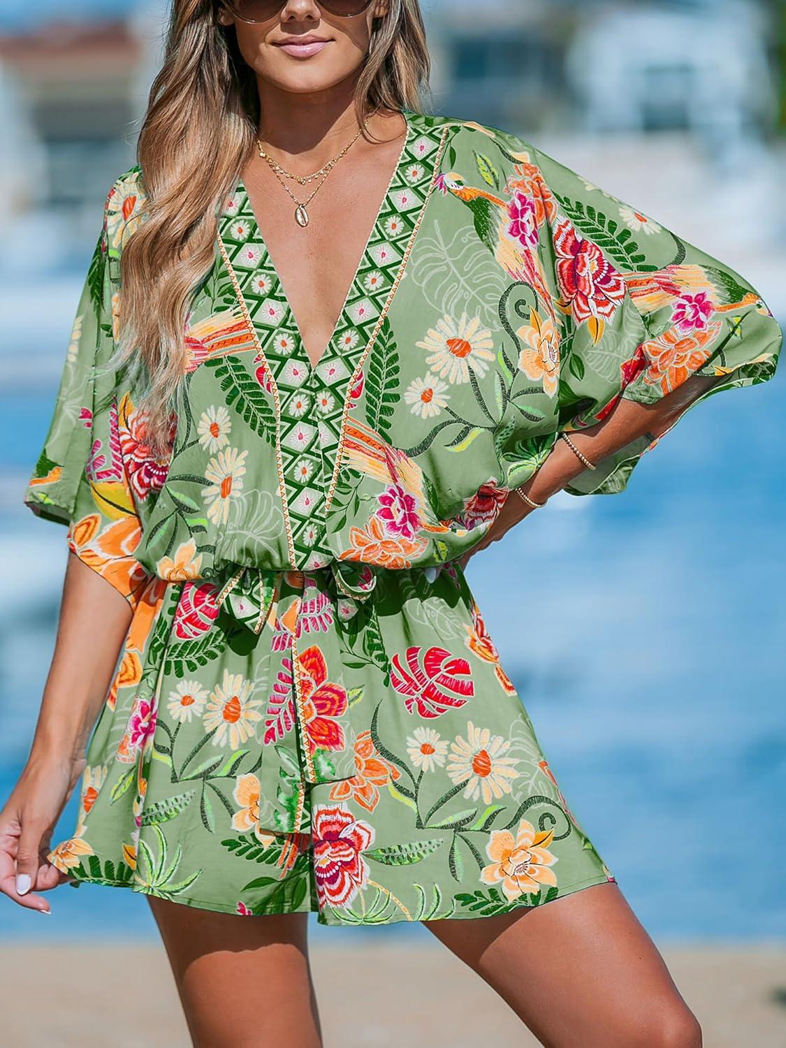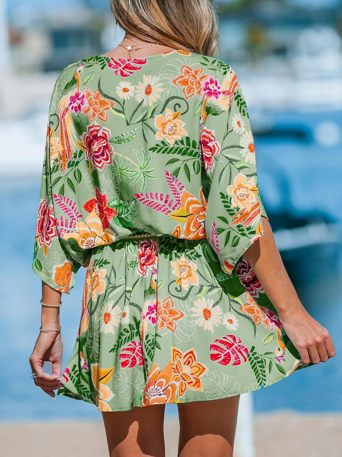 CUPSHE Women’s Mini Dress V Neck Floral Half Dolman Sleeve Belted Loose Fit Short Summer Beach Dress(Grass Green)