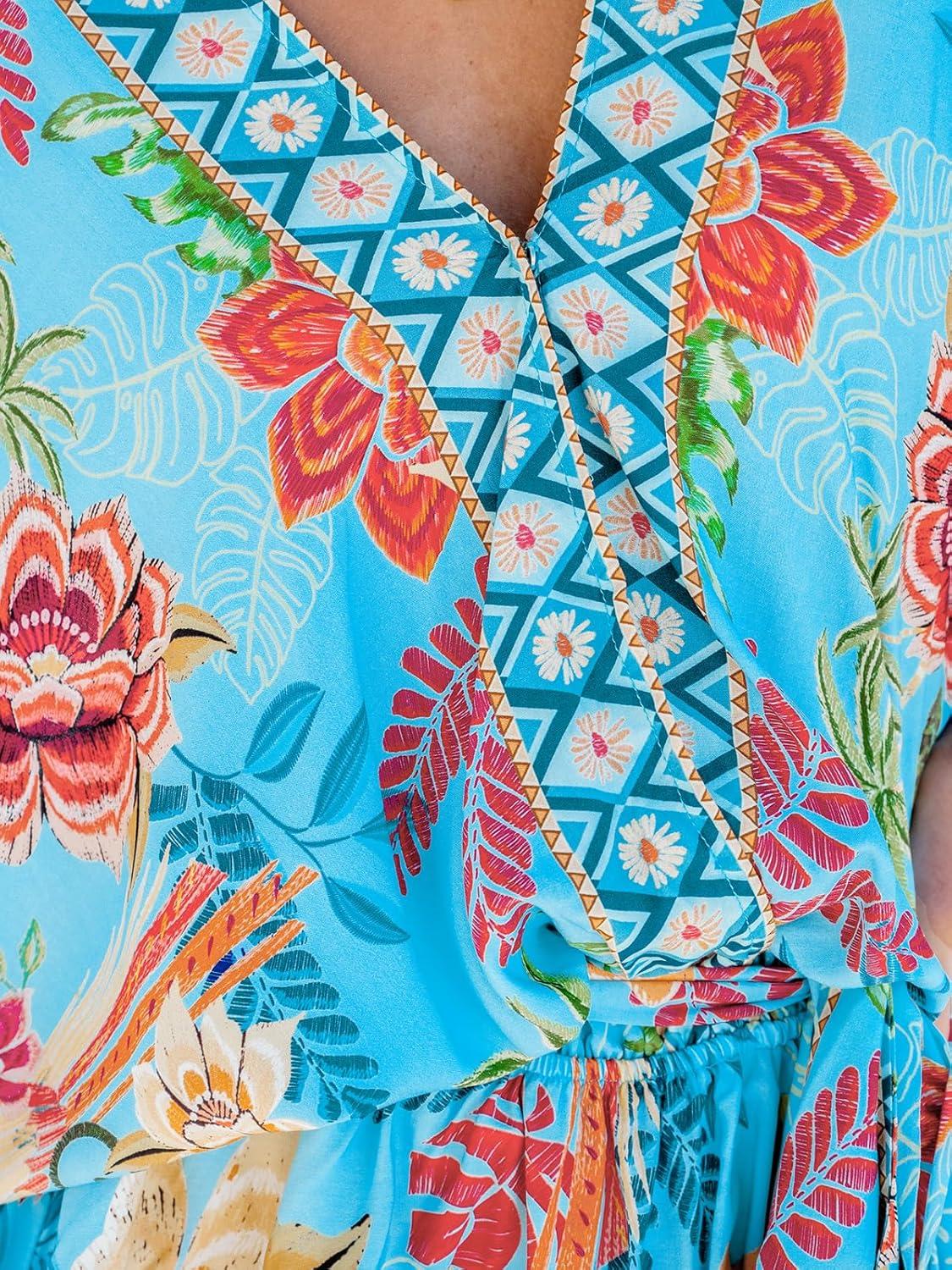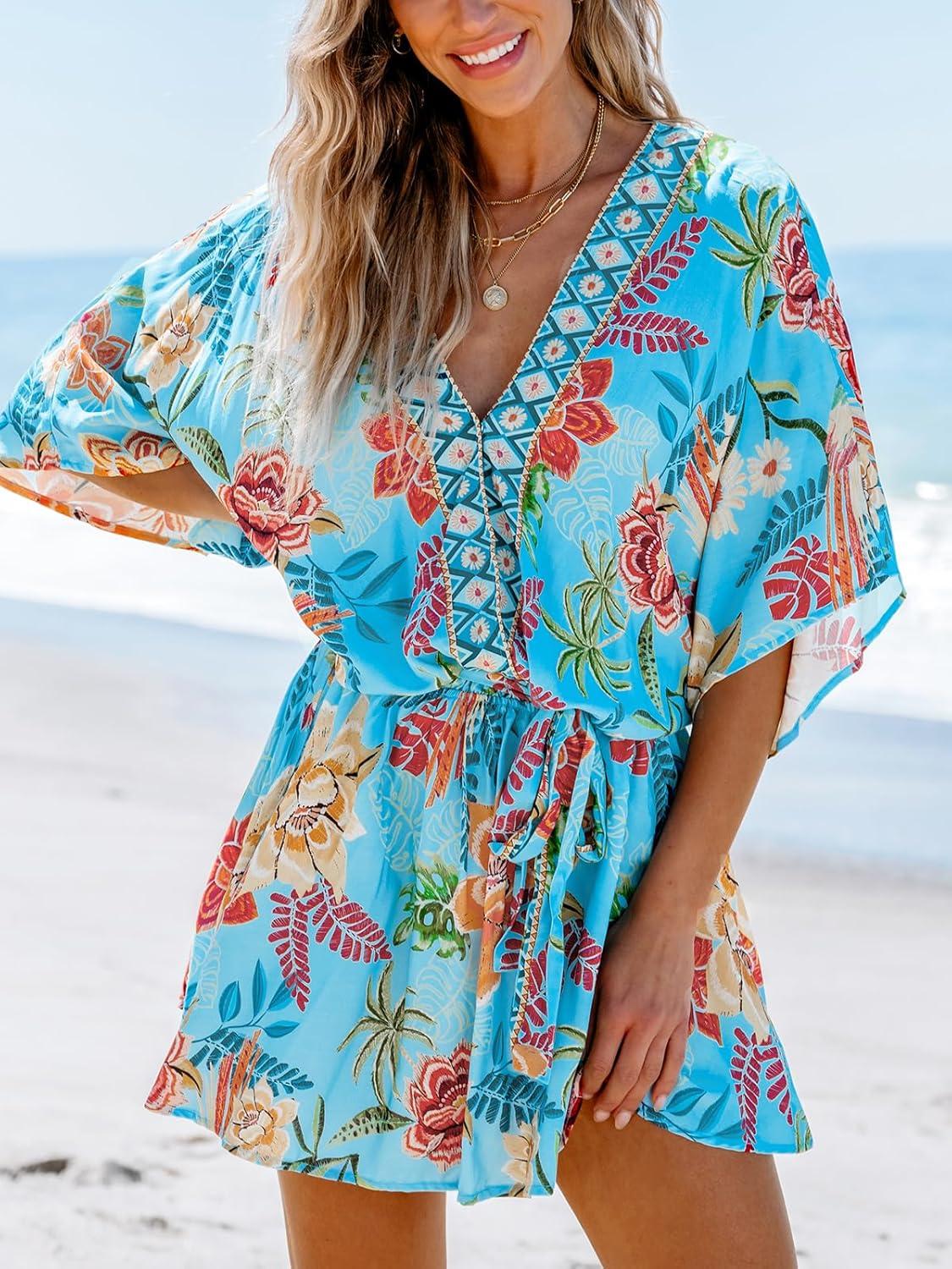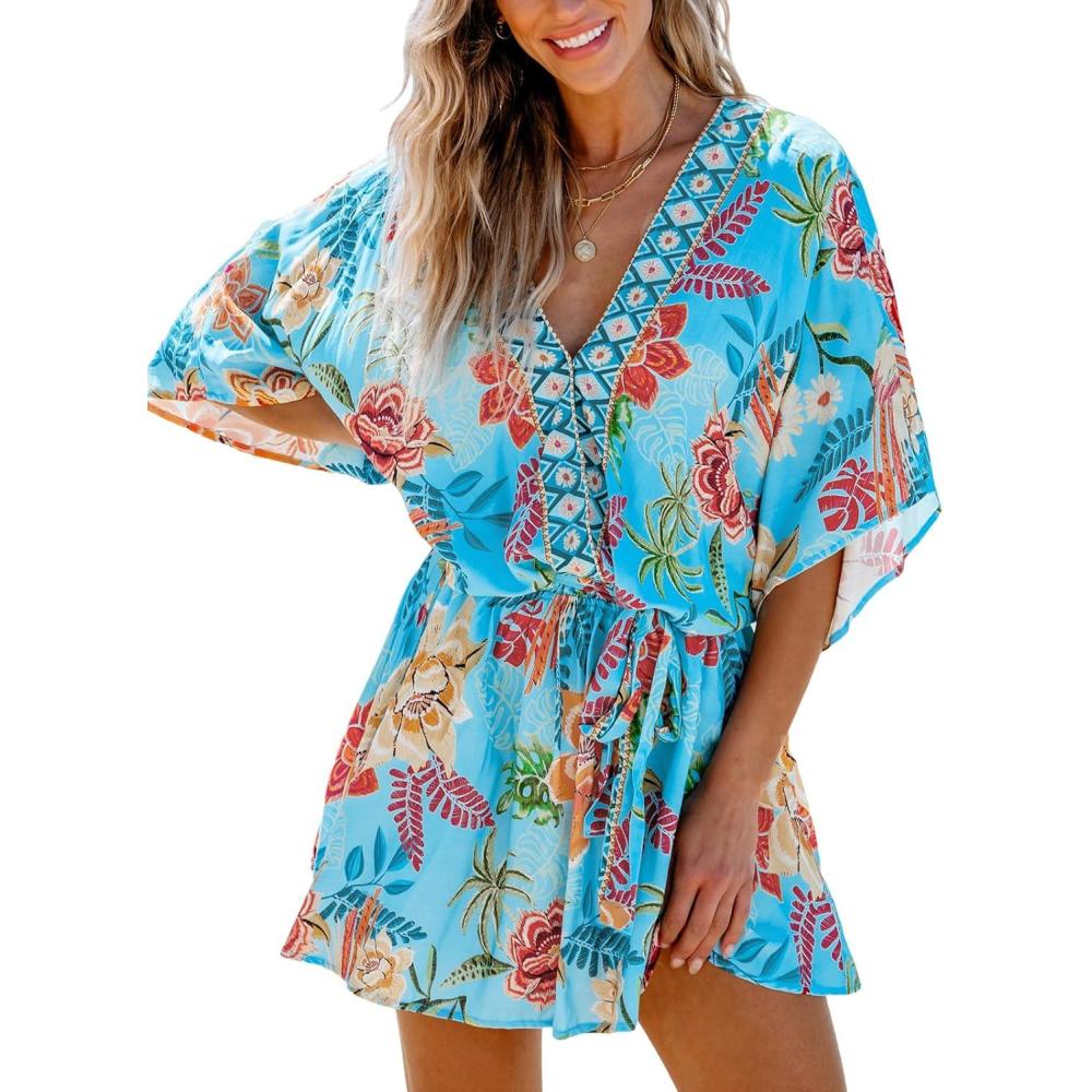 CUPSHE Women’s Mini Dress V Neck Floral Half Dolman Sleeve Belted Loose Fit Short Summer Beach Dress(Light Blue)