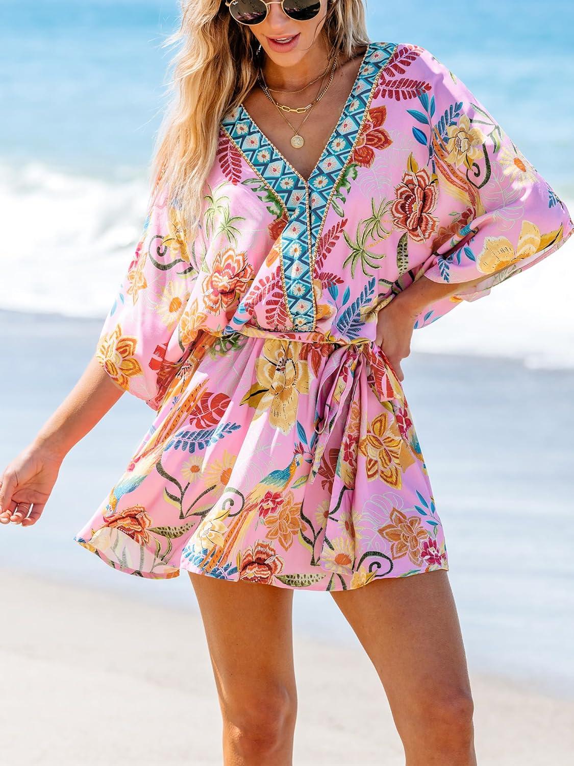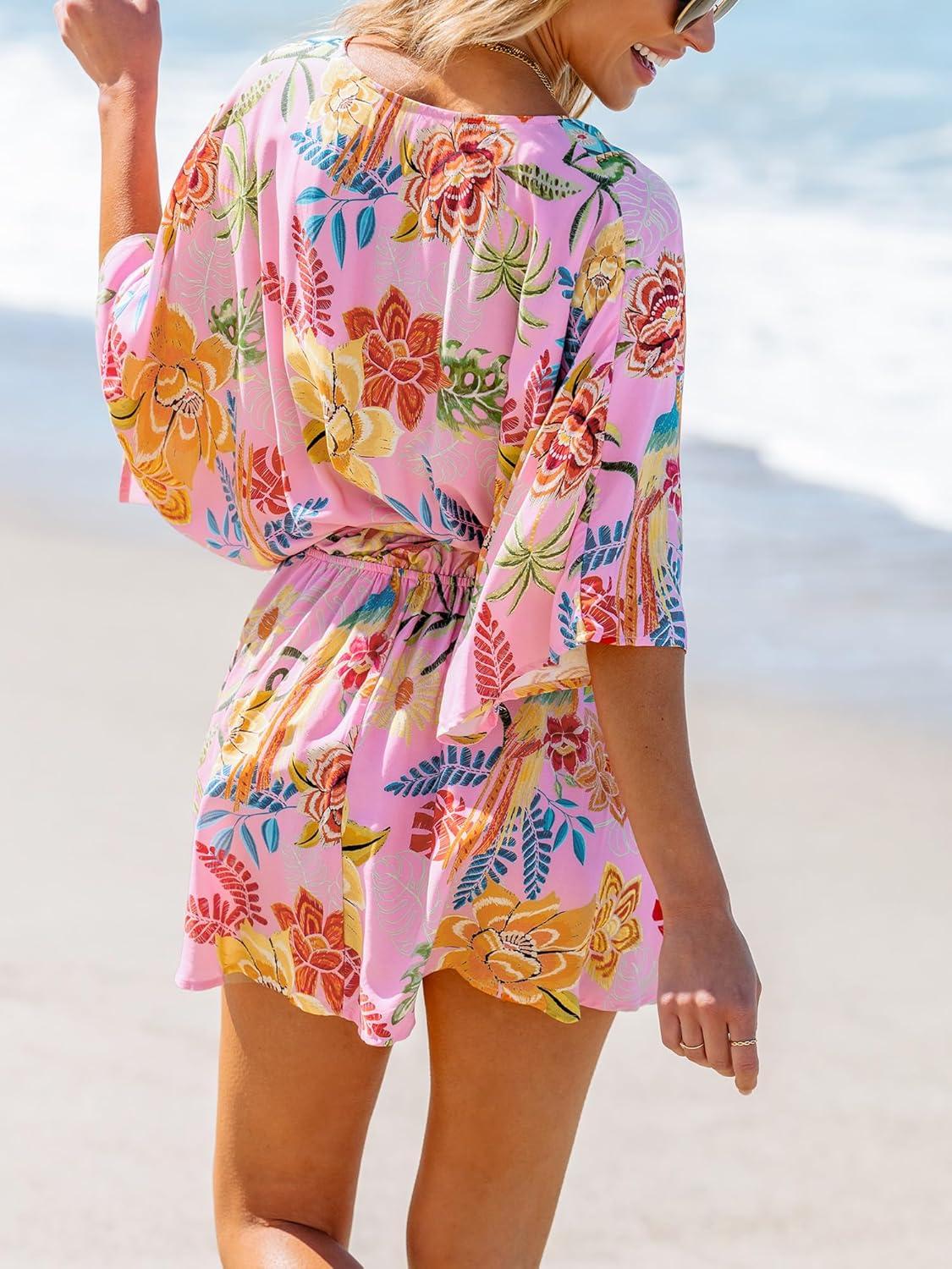 CUPSHE Women’s Mini Dress V Neck Floral Half Dolman Sleeve Belted Loose Fit Short Summer Beach Dress(Pink Tropical)