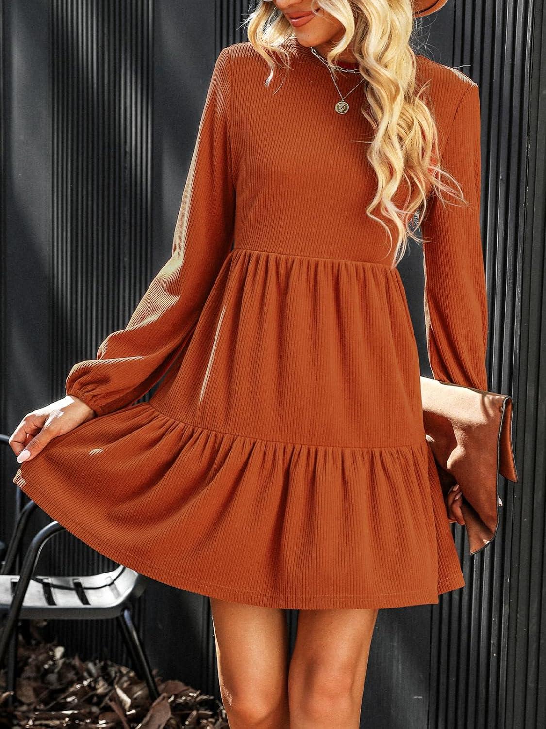 CUPSHE Women’s Mini Fall Dresses Knit Casual Long Sleeve Crew Neck Flowy Tiered Ruffled Short Sweater Dress(Burnt Orange)