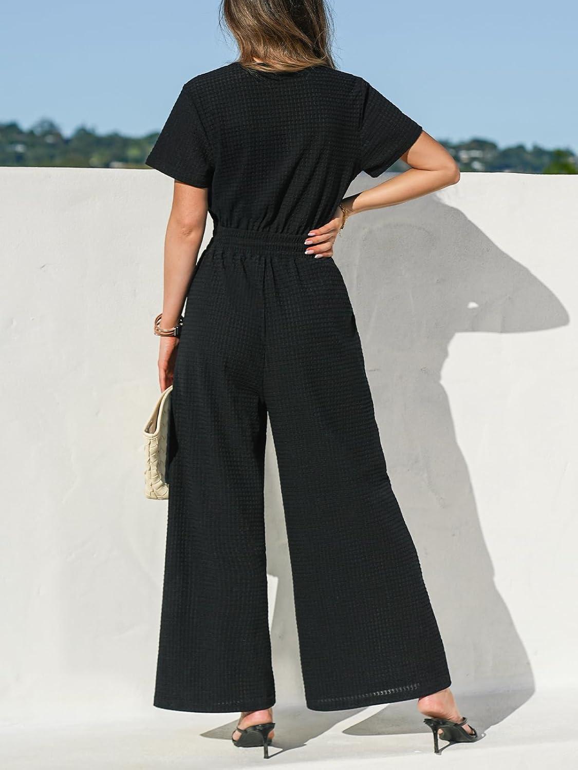 CUPSHE Women’s One Piece Jumpsuits Dressy Zip Up Casual Short Sleeve Rompers Loose Wide Leg Pants Overalls Vacation Outfits(Black)