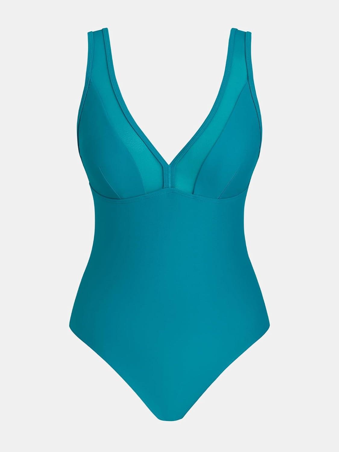 CUPSHE Women’s One Piece Swimsuit Bathing Suit Plunging V Neck Wide Adjustable Straps Mesh(Teal Blue)