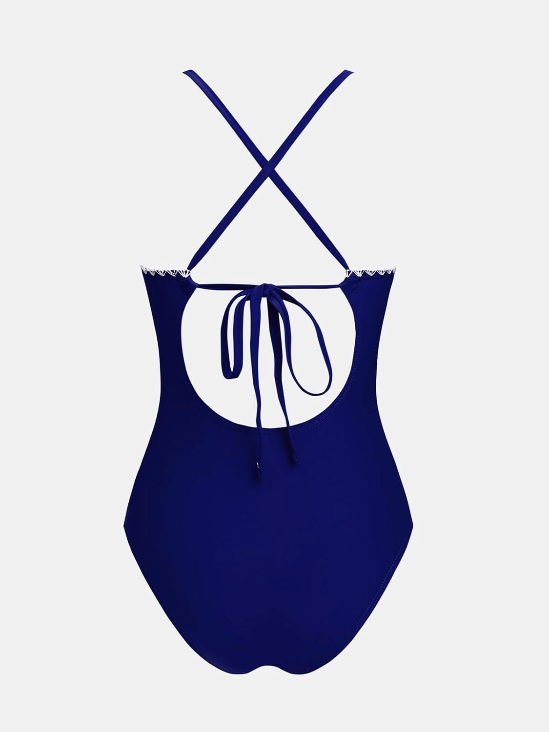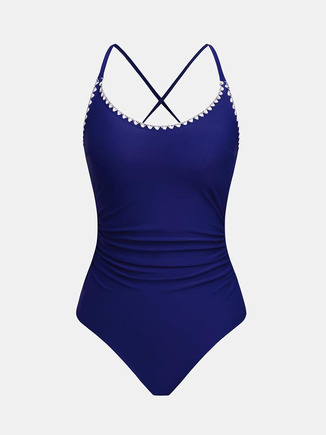CUPSHE Women’s One Piece Swimsuit Bathing Suit Scoop Neck Back Tie Shell Stitch Ruched Swimwear(Navy Blue)