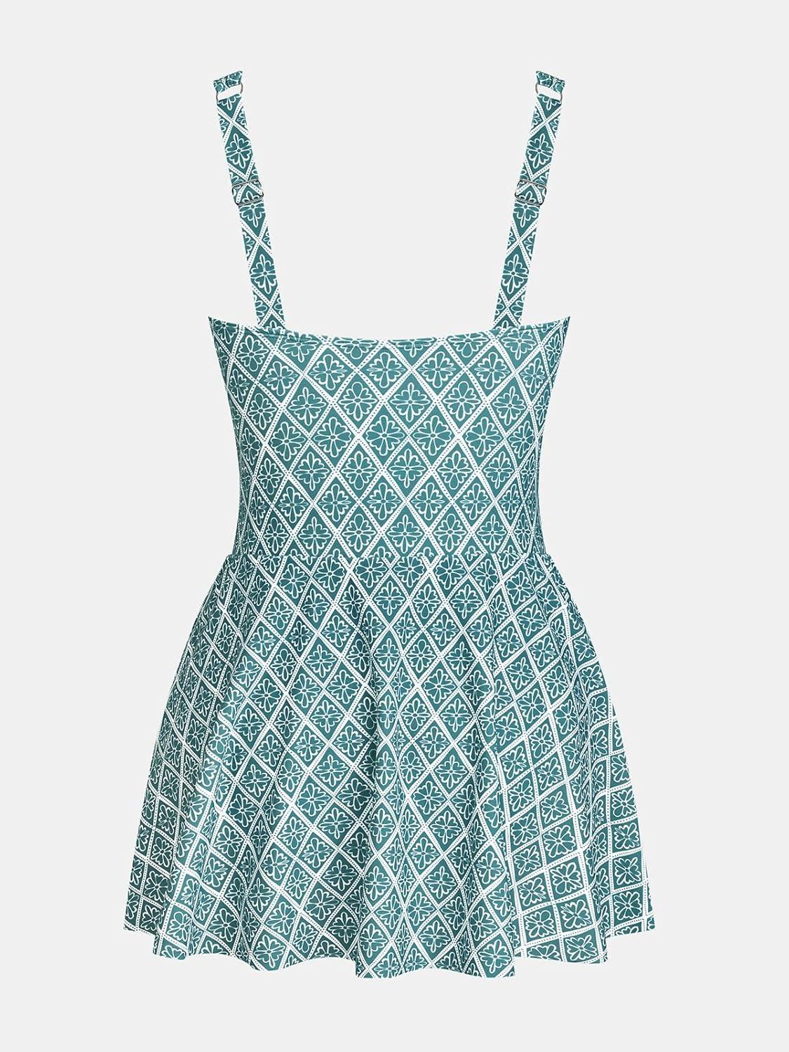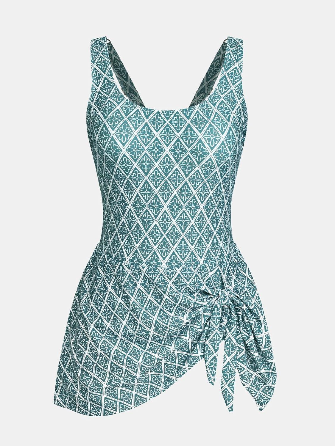 CUPSHE Women’s One Piece Swimsuit Bathing Suit Scoop Neck Swimdress Wide Straps Tie Knot Swim Skirt(Teal Green/White Geo Print)