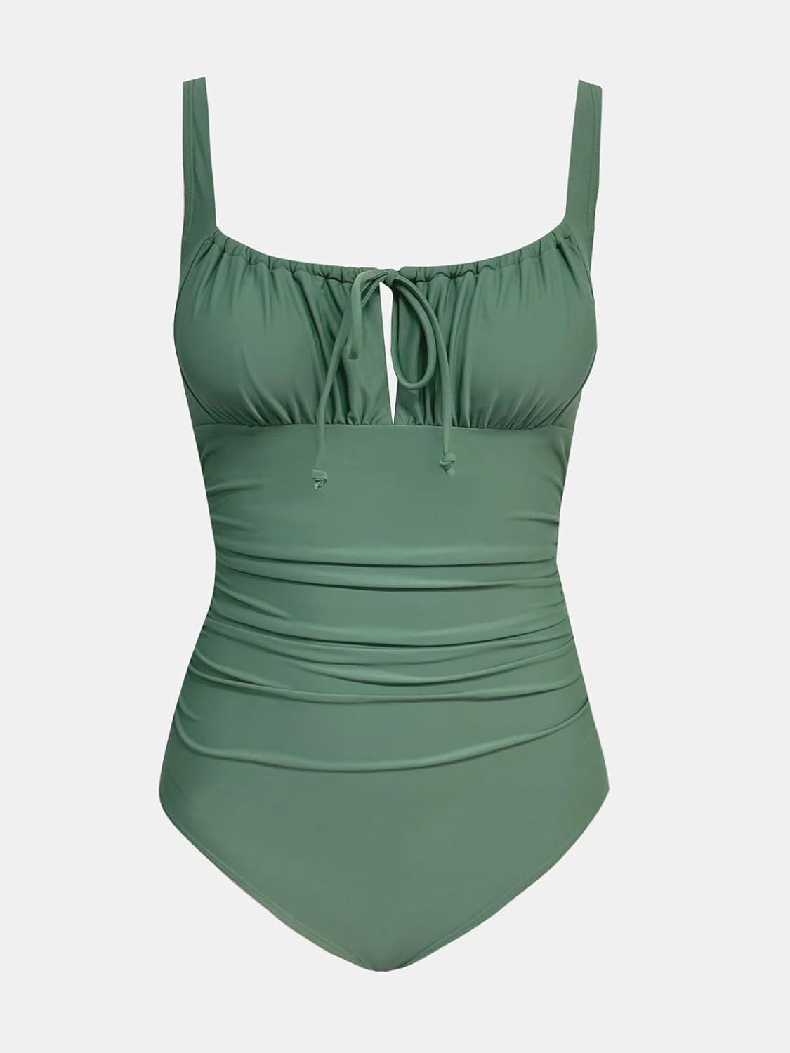 CUPSHE Women’s One Piece Swimsuit Bathing Suit Square Neck Back Cut Out Drawstring Self Tie Back Hook(Basil Green)