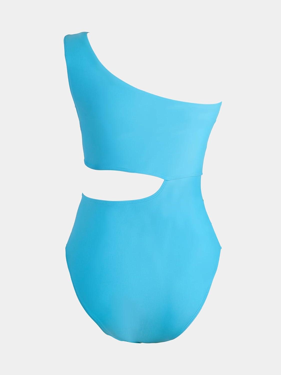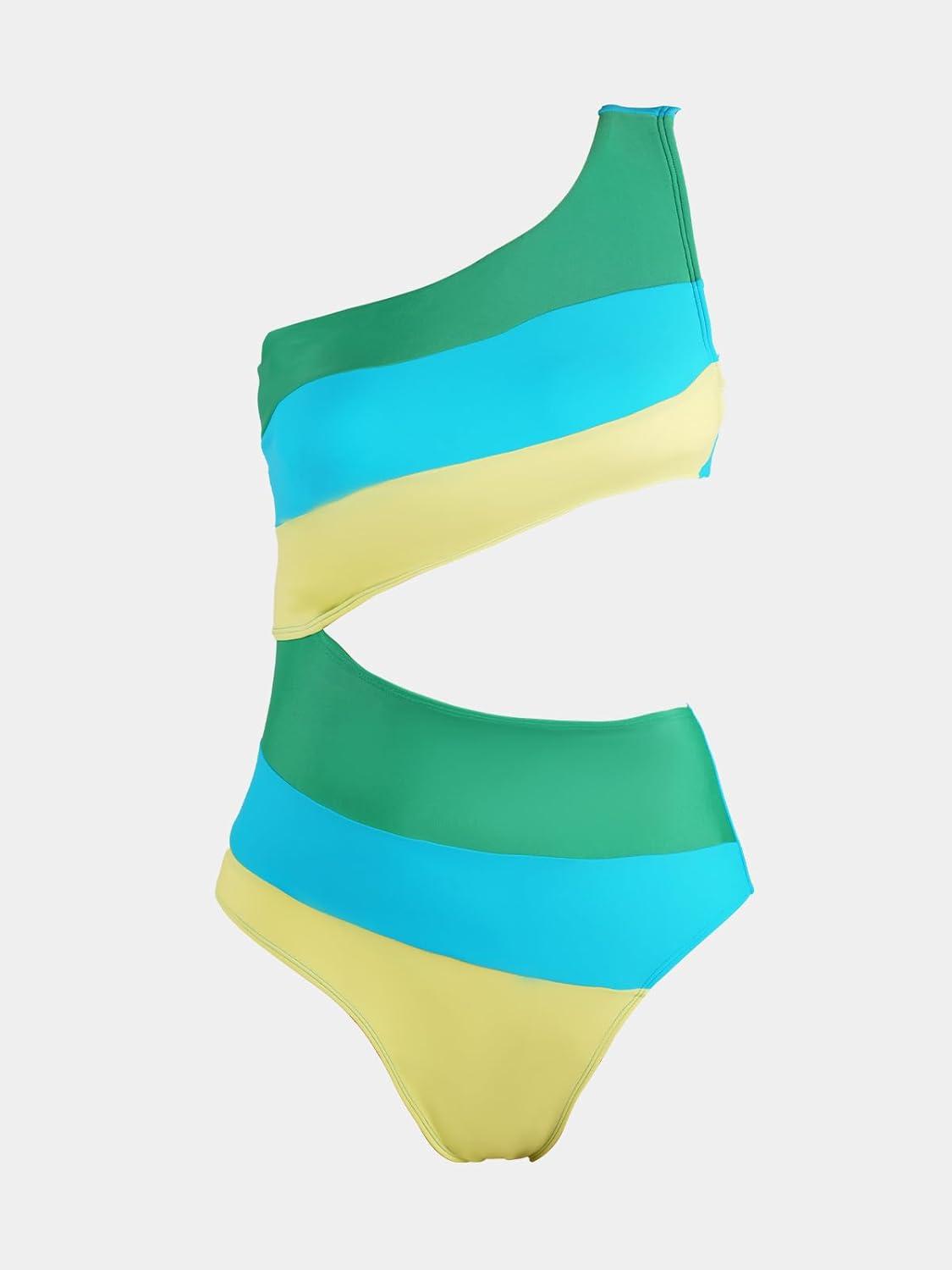 CUPSHE Women’s One Piece Swimsuit One Shoulder Bathing Suit Cutout Color Block Swimwear(Blue/Yellow Green)