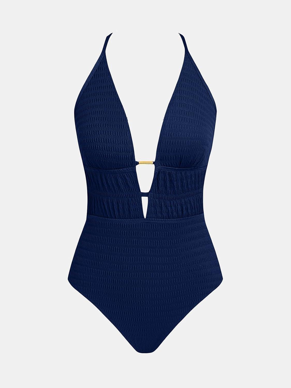 CUPSHE Women’s One Piece Swimsuit Plunging Neck Cutouts Bathing Suit Textured Ruched Crisscross Back Self Tie Swimwear(Navy Blue)