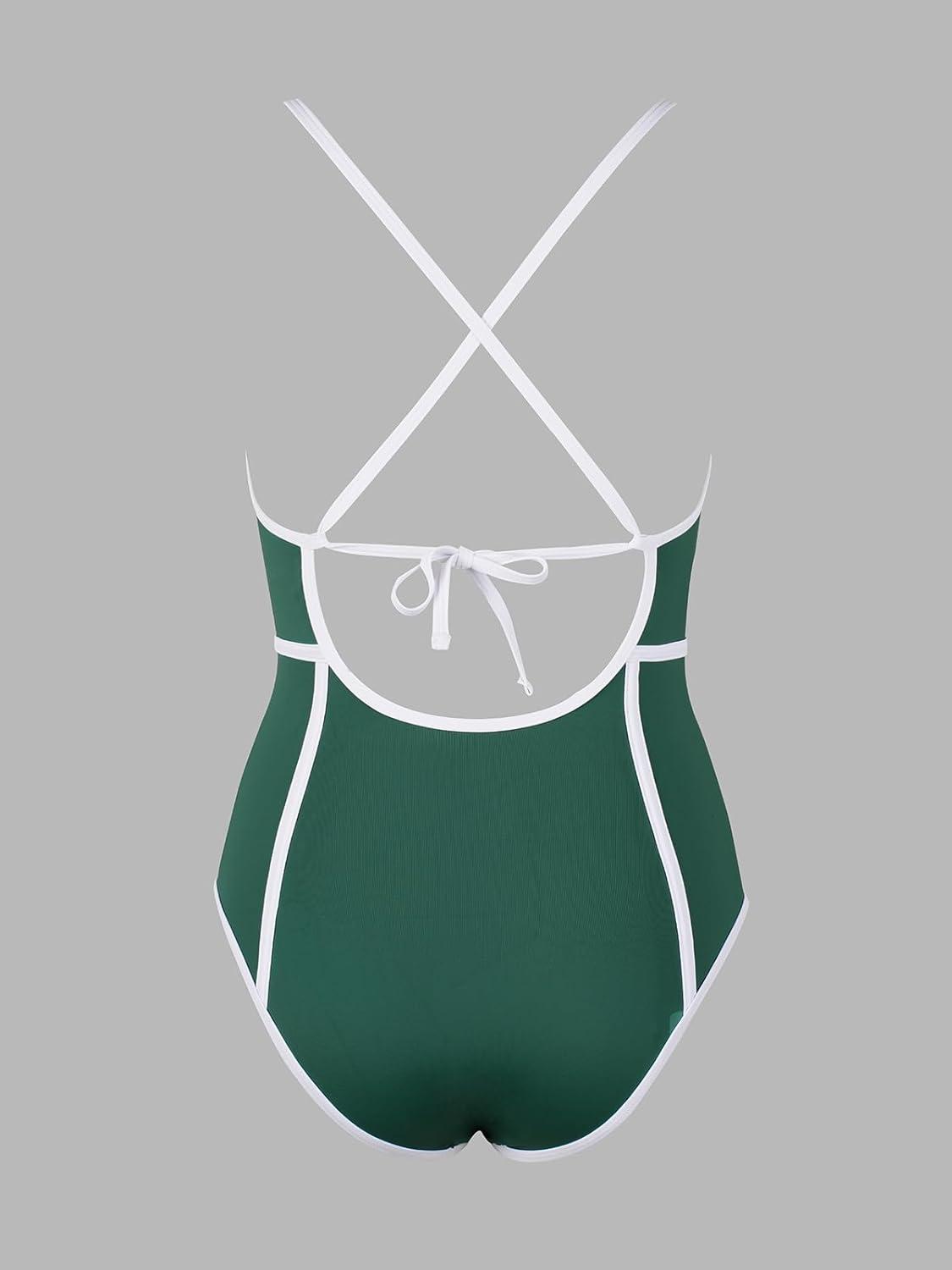 CUPSHE Women’s One Piece Swimsuit Plunging V Neck Bathing Suit Crisscross Back Tie Slimming Color Block(Green/White)