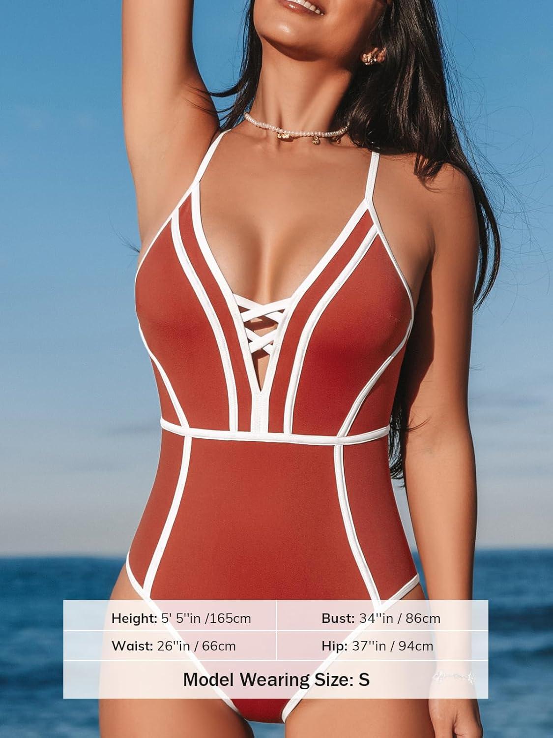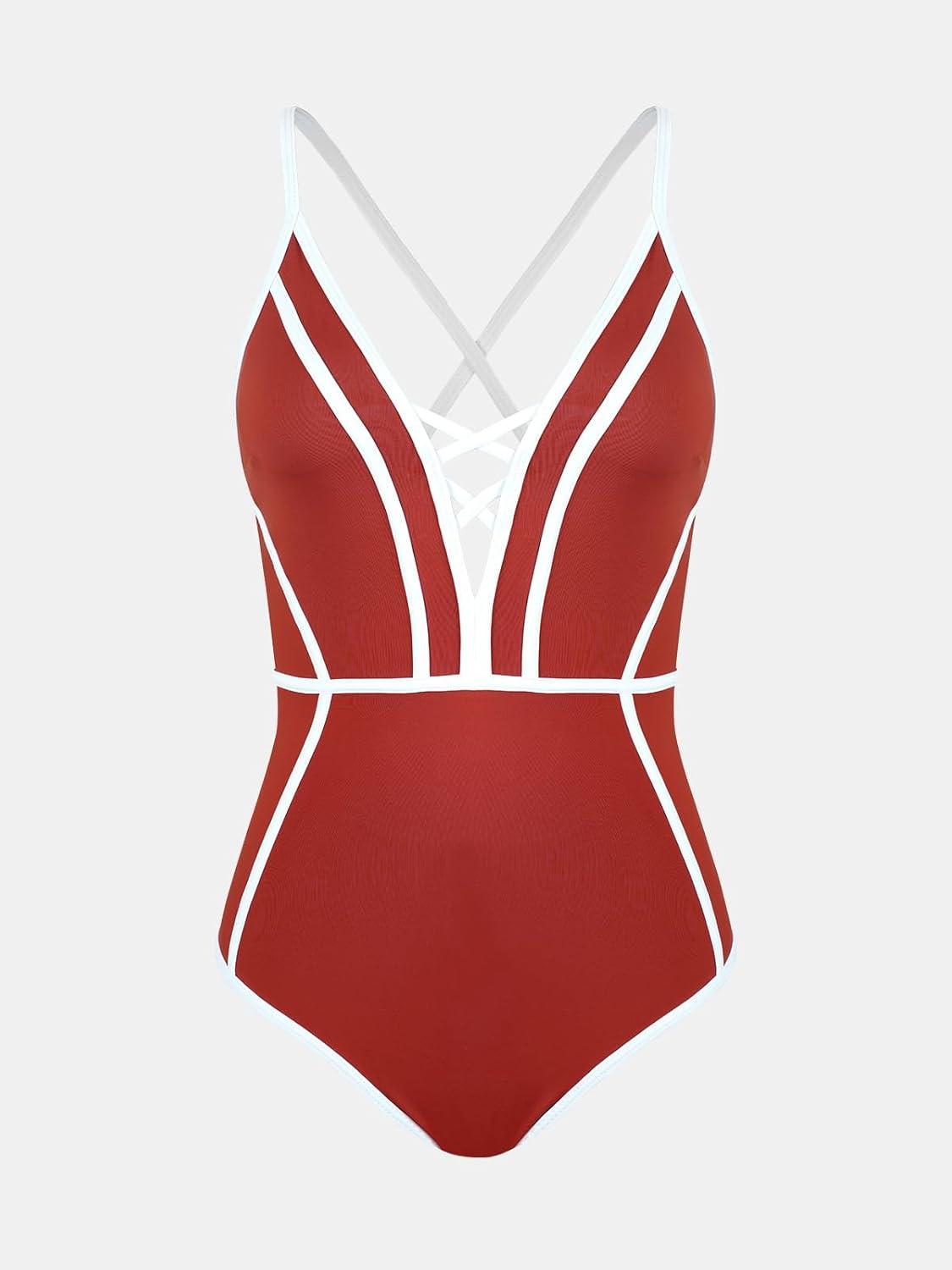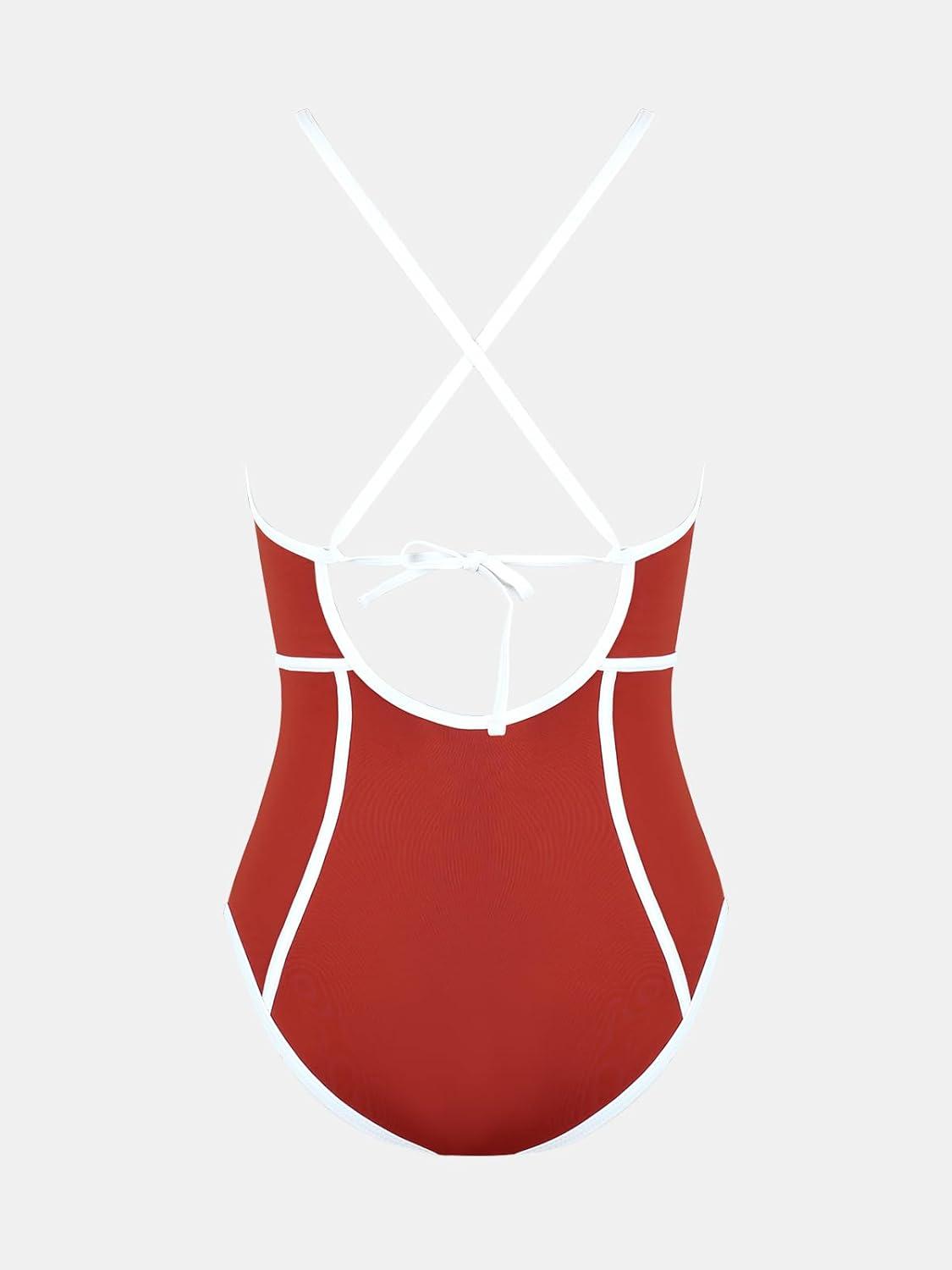 CUPSHE Women’s One Piece Swimsuit Plunging V Neck Bathing Suit Crisscross Back Tie Slimming Color Block(Red/White)