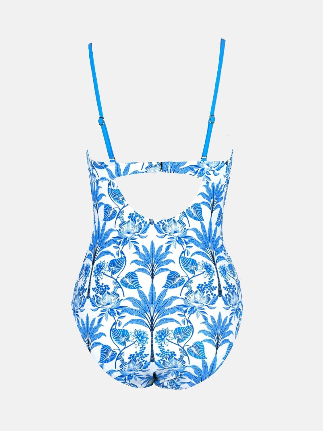 CUPSHE Women’s One Piece Swimsuit Plunging V Neck Bathing Suit Cutout Crisscross Back Adjustable Straps Spaghetti(White/Blue Floral)