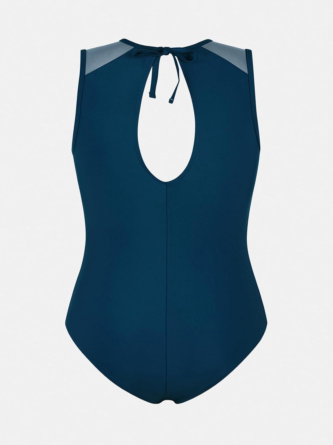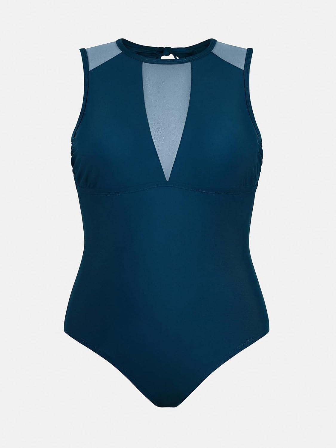 CUPSHE Women’s One Piece Swimsuit Plus Size Bathing Suit Mesh Crew Neck Swimwear Back Tie(Navy Blue)