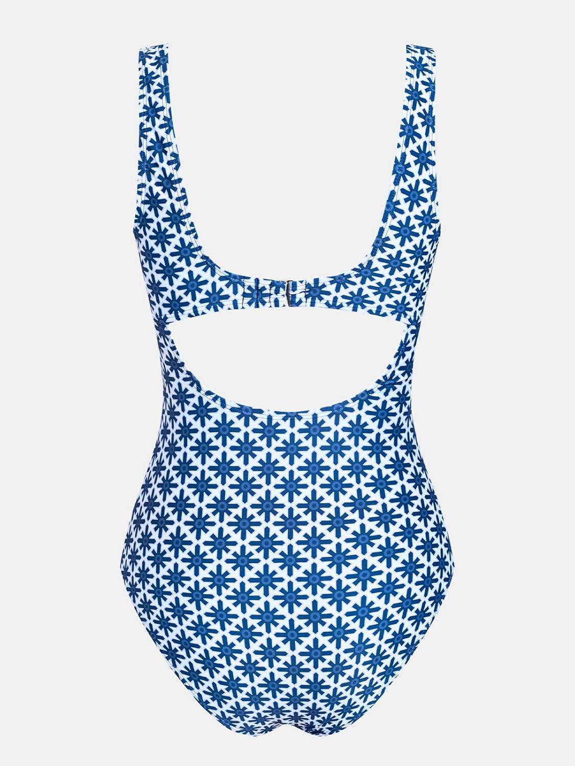 CUPSHE Women’s One Piece Swimsuit Square Neck Bathing Suit Wide Straps Back Hook Cutout Ruched Swimwear(Navy Blue/Geo)