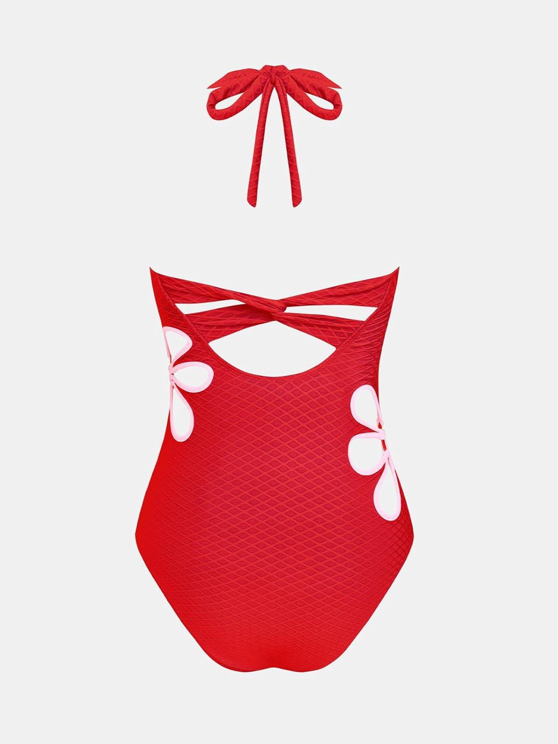 CUPSHE Women’s One Piece Swimsuit Square Neck Halter Self Tie Bathing Suit Cutouts Jacquard Swimwear Twisted(Red)