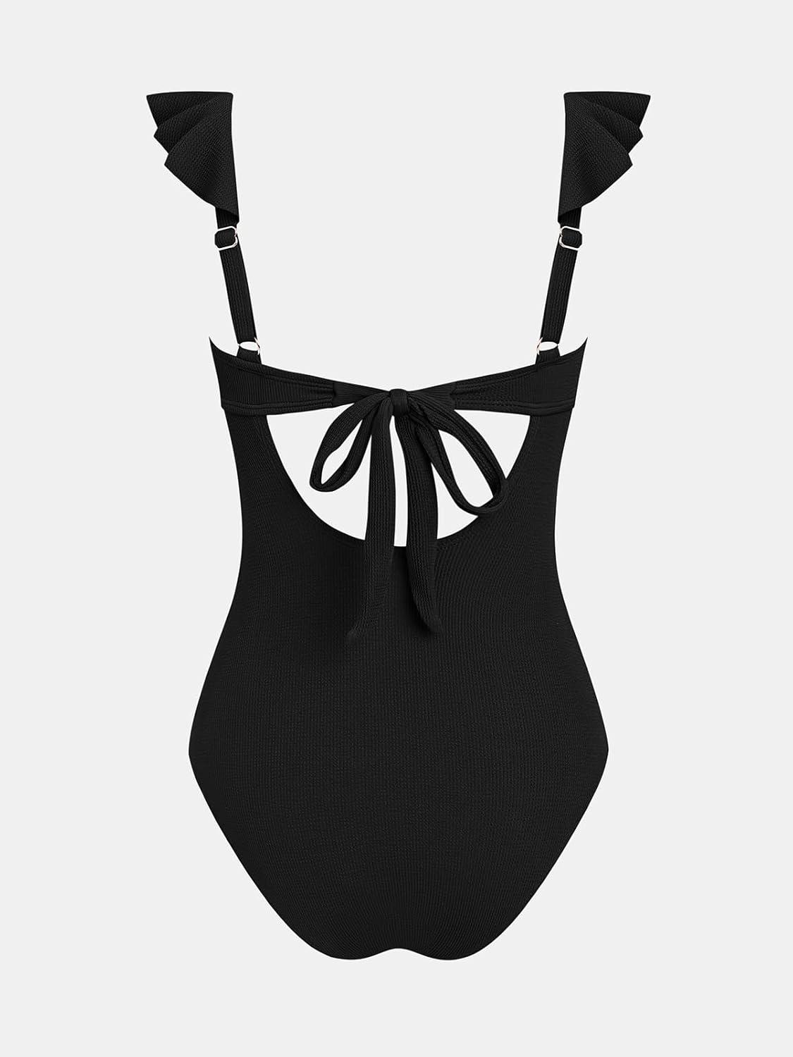 CUPSHE Women’s One Piece Swimsuit Square Neck Ruffled Bathing Suit Stitching Cutout Adjustable Straps Self Tie Textured(Black)