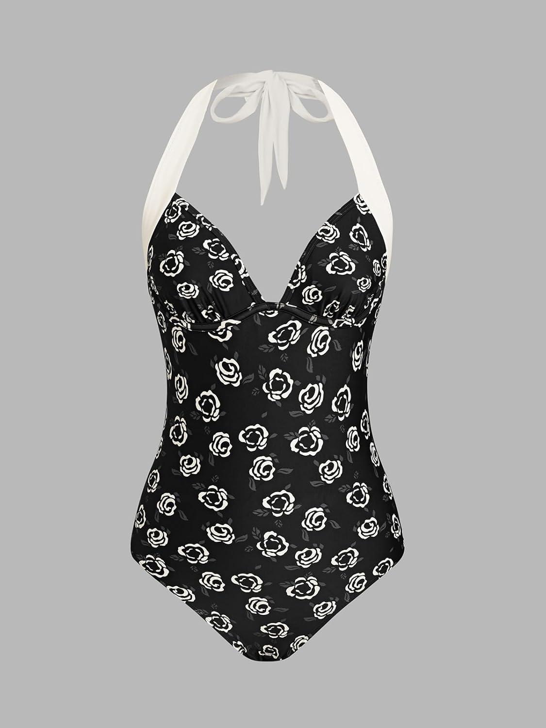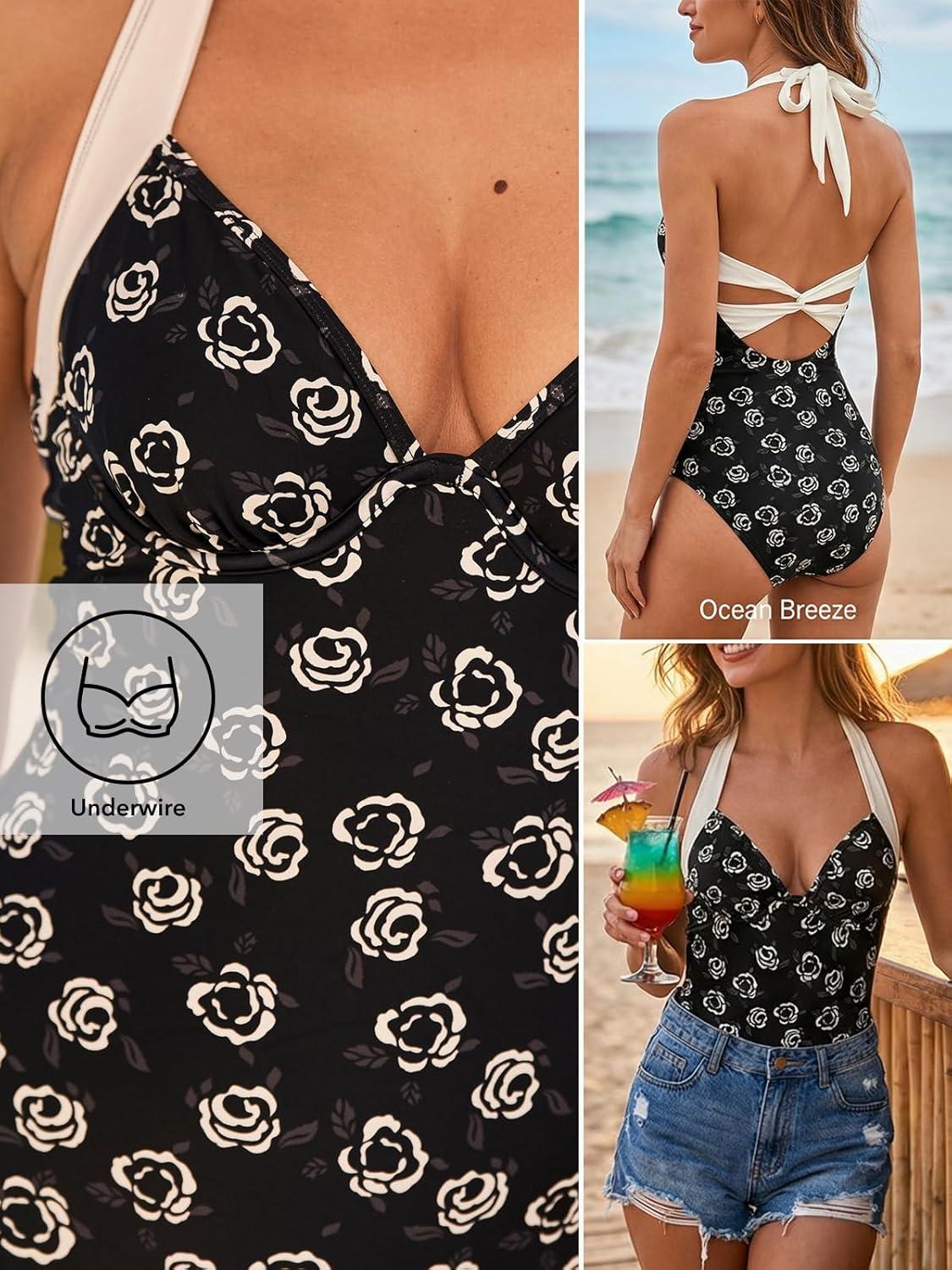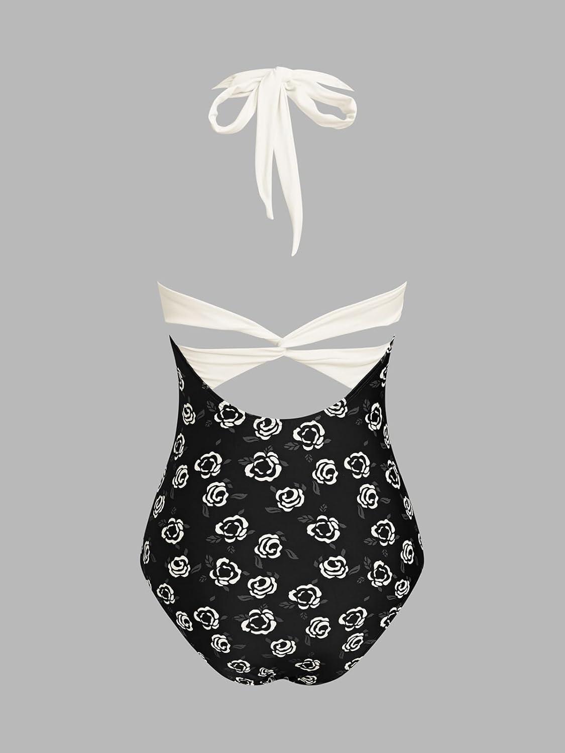CUPSHE Women’s One Piece Swimsuit Sweetheart Neck Halter Strappy Adjustable Underwire Bathing Suit Twisted(Black/Cream Rose)