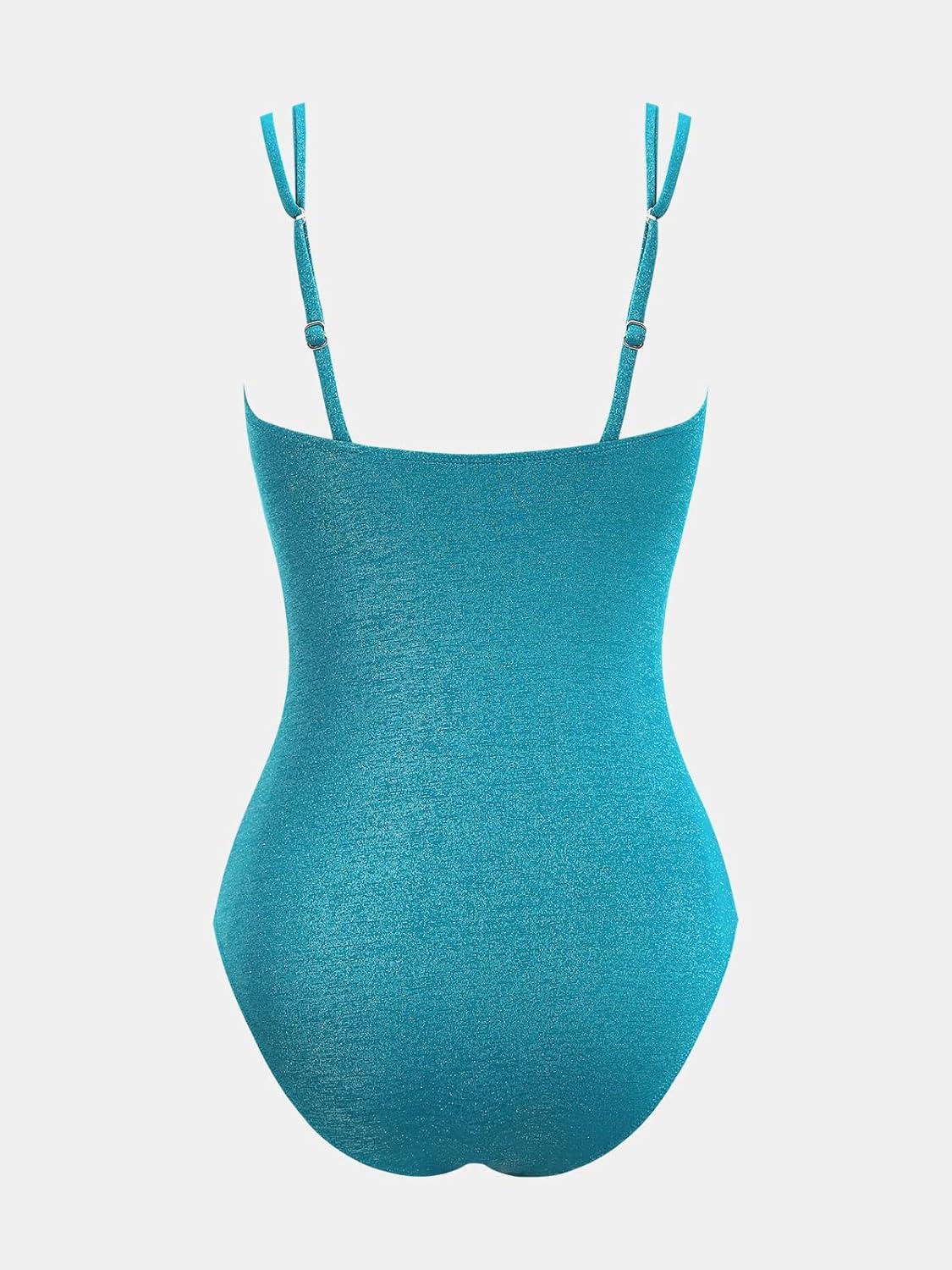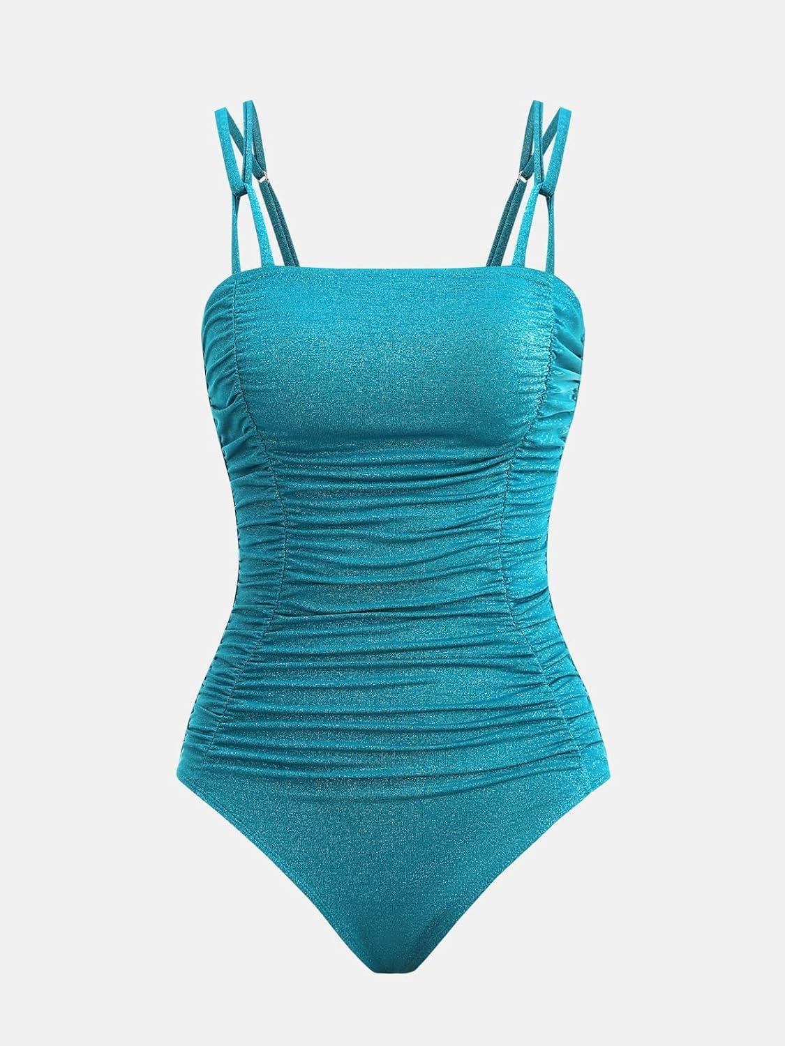CUPSHE Women’s One Piece Swimsuit Tummy Control Square Neck Bathing Suit Ruched Adjustable Straps(Teal Blue)