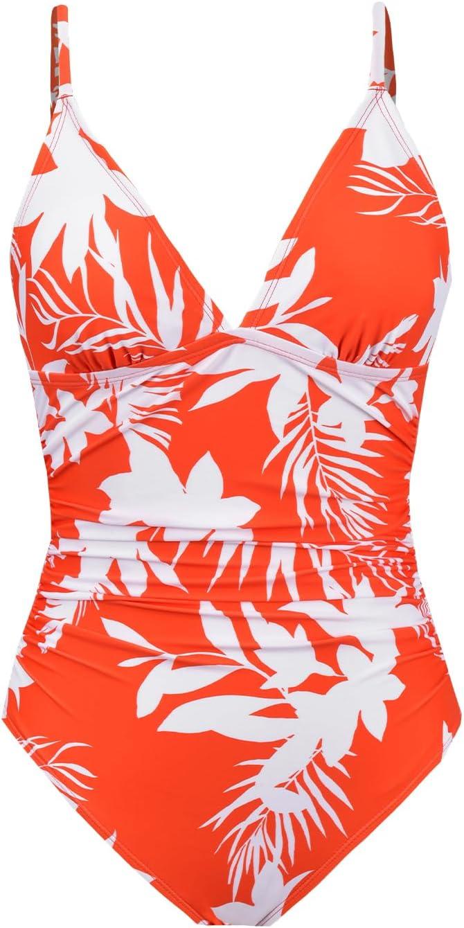 CUPSHE Women’s One Piece Swimsuit Tummy Control V Neck Bathing Suits(Orange/ Tropical)