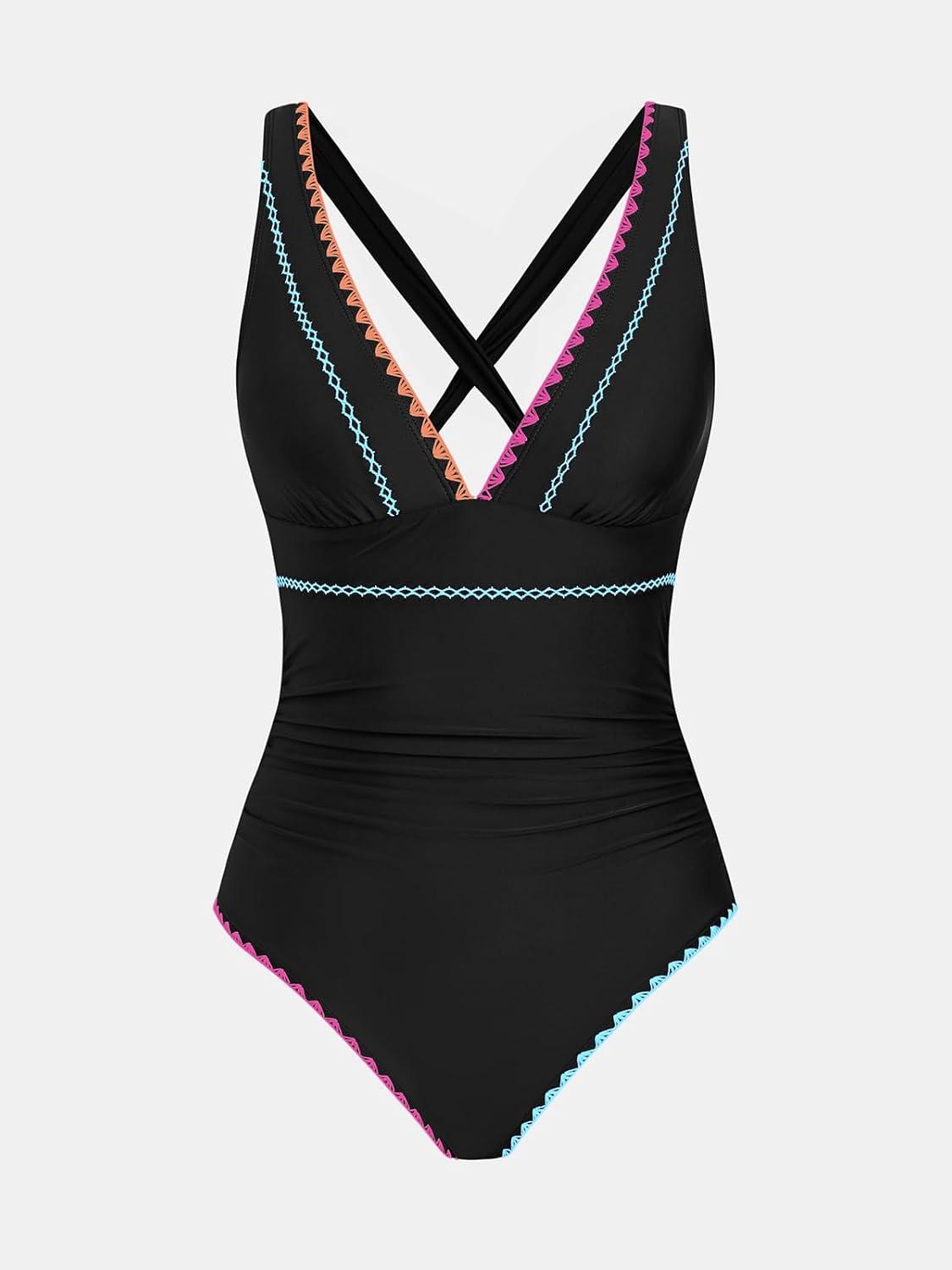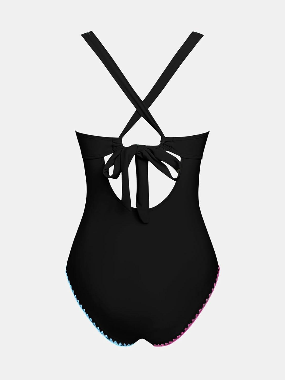 CUPSHE Women’s One Piece Swimsuit V Neck Shell Stitched Bathing Suit Adjustable Crisscross Strappy Ruched Swimwear(Black/Multicolor)