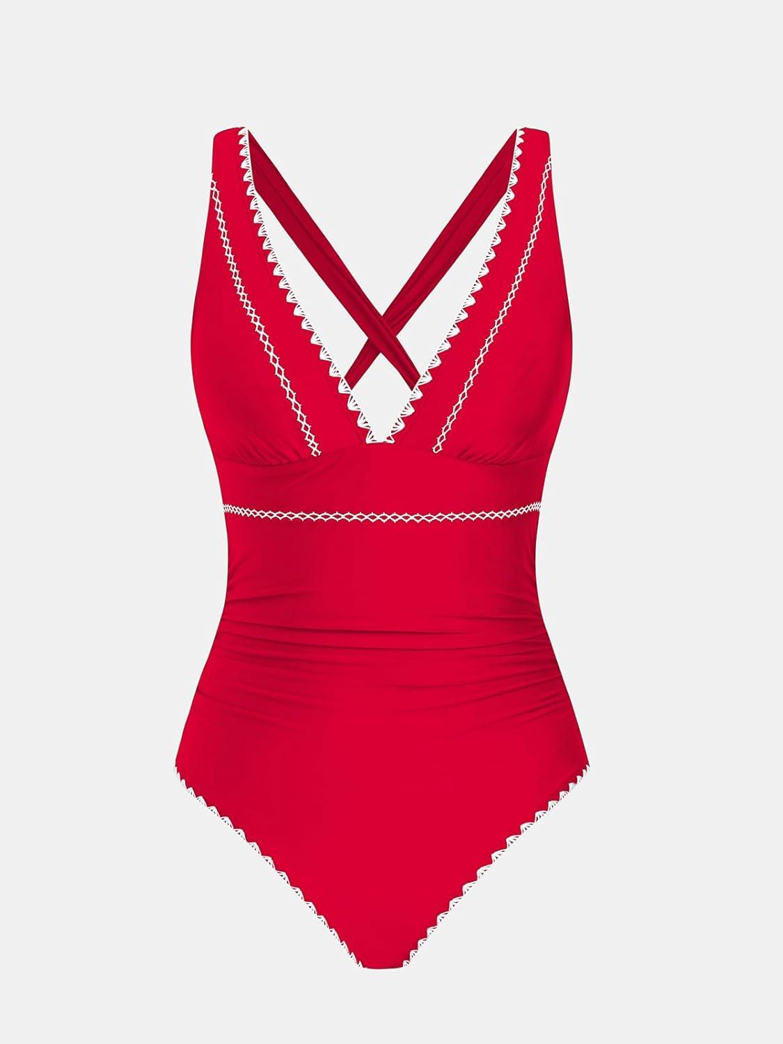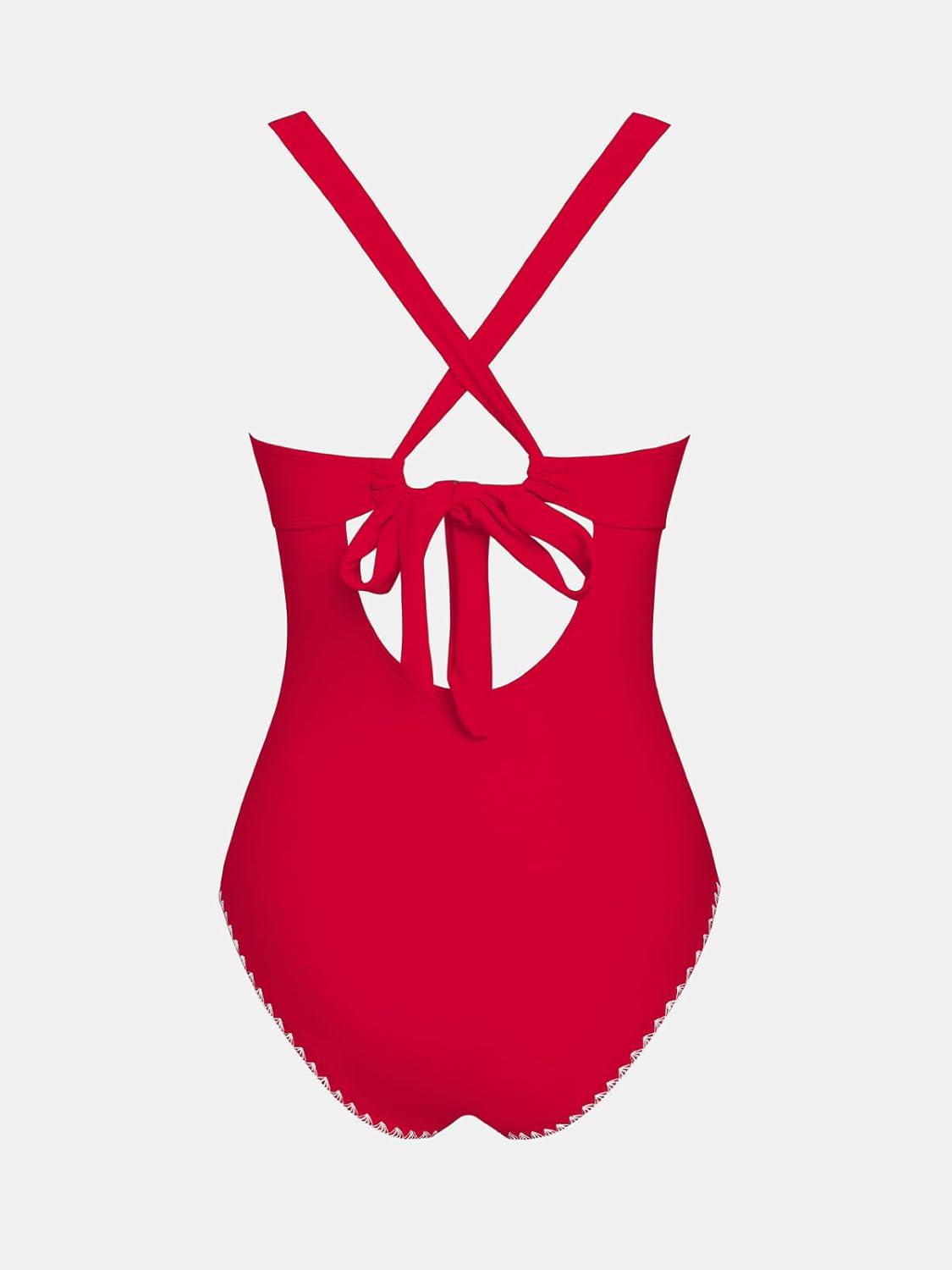 CUPSHE Women’s One Piece Swimsuit V Neck Shell Stitched Bathing Suit Adjustable Crisscross Strappy Ruched Swimwear(Red)