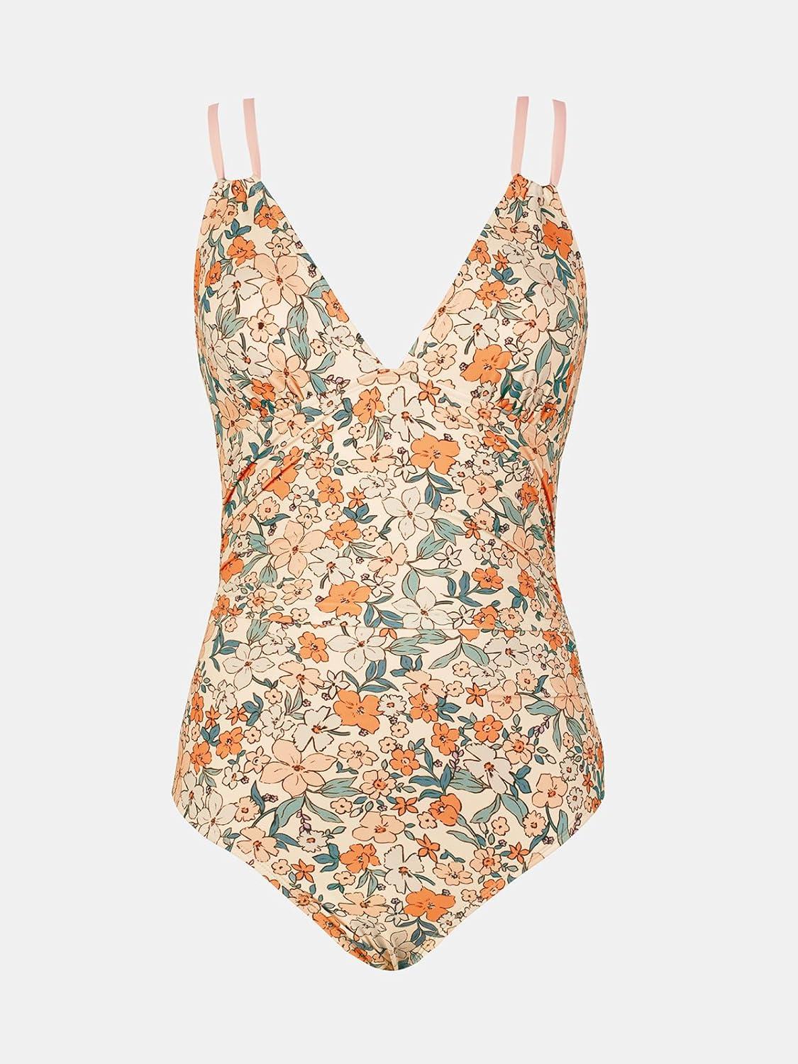 CUPSHE Women’s One Piece Swimsuit V Neck Tummy Control Double Adjustable Straps Back Cutout O-Ring(Orange/Yellow Floral)